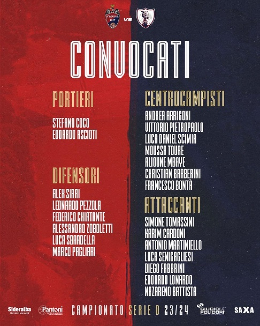 U.S. Sambenedettese, tutti i convocati per la trentesima giornata di campionato a L’Aquila.