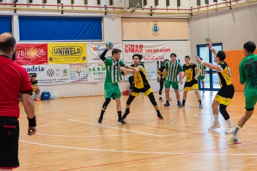 Partita combattuta nel primo tempo. In campo c’è anche, per la seconda volta consecutiva, il classe 2007 Tritto, che ha figurerà. Clima nervoso per qualche scoria della gara di andata: comportamento ai limiti del regolamento, spesso provocatorio, per gli ospiti. Nella ripresa però l’HC dimostra di essere nettamente superiore e il 19-20 con cui si va al riposo, diventa nel finale 33-30 (ma in alcuni momenti i verdi toccano anche il +6). Coach Vultaggio, grazie pure alle parate di Mucci, dà spazio a chi di solito gioca meno. Buone le prove dei 2007 Mirko Salladini e Vagnoni.