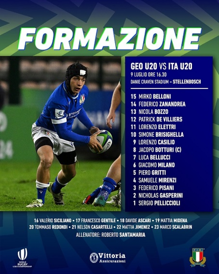 Le previsioni meteo per martedì pomeriggio, così come per i giorni a seguire, annunciano sul Danie Craven di Stellenbosch – sede designata per il match con direzione affidata al sudafricano Morné Ferreira – condizioni di pioggia pesante con vento forte, condizionando strategia e alcune delle scelte tecniche effettuate: “Sappiamo benissimo che match ci aspetta contro la Georgia, squadra completa in tutti i reparti che nella gara contro l’Irlanda ha confermato ampiamente le sue caratteristiche di aggressività, fisicità ed efficacia nella fasi di conquista”, commenta l’head-coach Roberto Santamaria. “Noi dopo l’Australia abbiamo fatto un’analisi approfondita di quello che ha funzionato e delle aree del gioco dove martedì dovremo lavorare di più e meglio, avendo però ben chiara in testa una cosa: sarà una battaglia vera dal primo all’ultimo minuto, e solo dando ognuno di noi, staff compreso, il 100% restando lucidi e umili fino alla fine saremo in grado di giocarci la partita che vogliamo”.