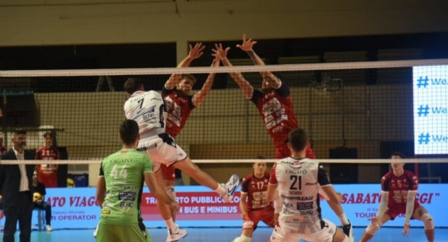 Il sestetto di Grottazzolina parte con il freno a mano tirato, poi si riprende e per un soffio non porta il match al quinto set ma sul finale la differenza la fanno i dettagli ed un Gironi super da 25 punti personali.