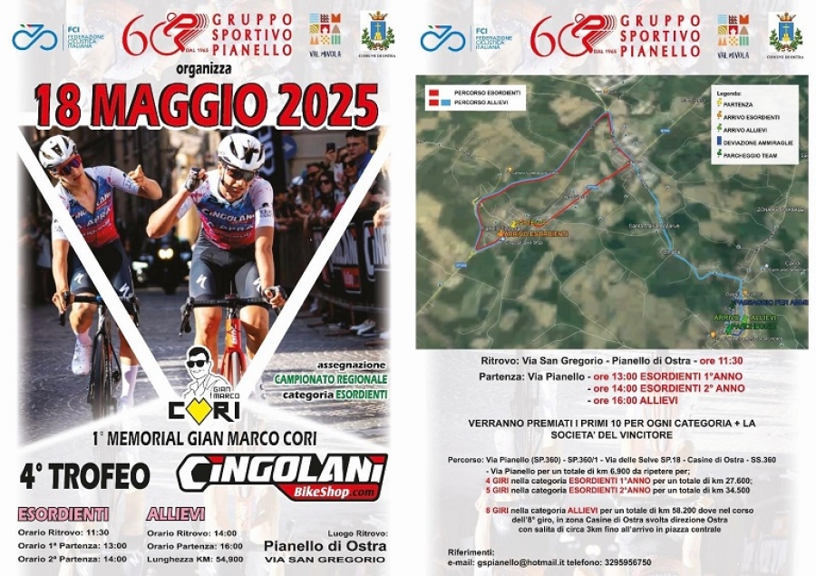 Pianello d'Ostra – Si disputa domenica 18 maggio per la quarta volta a Pianello d’Ostra il Trofeo Cingolani Bike Shop organizzata in modo impeccabile dal Gruppo Sportivo Pianello.