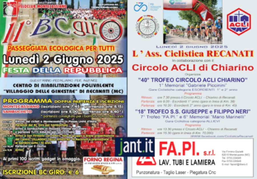 La giornata prenderà il via al mattino con le gare riservate agli esordienti: alle 9:00 scatterà la prova dei primo anno (31 chilometri), mentre alle 10:20 toccherà ai secondo anno (45 chilometri). Nel pomeriggio alle 15:30, sarà la volta degli allievi, chiamati a misurarsi su un tracciato di 70 chilometri. Tre gare di maggior richiamo nell’arco di un’unica intensa giornata, che vedranno al via il meglio del ciclismo locale e non solo: tra i nastri di partenza, infatti, ci saranno 58 iscritti tra gli esordienti primo anno, 59 tra i ragazzi di secondo anno e ben 78 allievi pronti a darsi battaglia. Su indicazione del comitato regionale FCI Marche, la manifestazione ricorderà la figura di Gaetano Gazzoli con un minuto di raccoglimento prima della partenza, così come avverrà in tutti gli altri eventi ciclistici del calendario regionale previsti per il ponte 1-2 giugno. MONTECASSIANO – Pedalare senza fretta, ma con un obiettivo importante: fare del bene, insieme. Tutto questo il 2 giugno con l’undicesima edizione del “BC Giro” a cura del Velo Club Montecassiano. L’appuntamento è per tutti gli appassionati di ciclismo e non solo: l’evento, ormai ben radicato nel panorama locale, propone un percorso non competitivo di circa 23 chilometri che partirà alle 7:45 da piazza Unità d’Italia a Montecassiano e poi si raggiungerà Sambucheto alle 8:00 in piazzale Vittime del Lavoro. Da lì un unico corteo per arrivare tutti insieme in località San Firmano di Montelupone con ristoro e foto di gruppo. La manifestazione, oltre a promuovere lo sport e il territorio, sosterrà il Centro di Riabilitazione “Villaggio delle Ginestre” di Recanati. ACQUASANTA TERME – A cura del Progetto Ciclismo Piceno l’appuntamento marchigiano del tour nazionale BICIMPARO Kinder Joy of Moving che sarà ospitato lunedì 2 giugno ad Acquasanta Terme presso la frazione di Cagnano con riferimento agli impianti sportivi Manlio Carnicelli (ritrovo alle 13:00 e inizio delle gare alle 14:30). L’evento baby under 13 vedrà impegnati in una serie di sfide volte a mettere alla prova tecnica e preparazione e al termine sarà decretata la squadra rappresentativa del Comitato Provinciale Altoatesino, che prenderà parte alla finale nazionale del meeting giovanile di Viareggio. Sono previste due tipologie di percorso: in ognuno di essi sono presenti ostacoli artificiali da superare e sarà dedicato a specifiche categorie, in particolare: percorso 1 categorie G1, G2, G3, PG, ID e C21 M/F: percorso 2 categorie G4, G5, G6 M/F Ogni atleta dovrà percorrere il percorso a lui assegnato nel minor tempo possibile. Le eventuali penalità verranno scontate nel corso della prova aggirando, una o più volte, un cono posizionato nella zona di arrivo di ciascun rettilineo. Ogni atleta avrà a disposizione due prove; verrà preso in considerazione il tempo migliore ottenuto. Per ogni percorso verrà stilata una classifica in base ai tempi ottenuti dagli atleti che hanno effettuato la prova. I migliori 16 tempi tra le categorie G4, G5, G6 M/F, ottenuti nel percorso dedicato, prenderanno parte alla successiva prova di gimkana/sprint. Sempre in ambito promozionale-giovanile ci si sposta a Cingoli per recuperare l’appuntamento di Gioco Ciclismo (Nove Fossi Kids) per bambini fino 12 anni su di un breve percorso pianeggiante e sterrato, con piccole difficoltà e giochi di abilità ciclistica sotto il controllo di istruttori federali (di Avis Bike Cingoli) al parco giochi comunale Don Adriano con inizio alle 9:30. Stessa manifestazione di Gioco Ciclismo anche a Matelica per il Baby Garden Bike (Gruppo Ciclistico Matelica) presso i Giardini Pubblici con avvio delle attività alle 14:30.