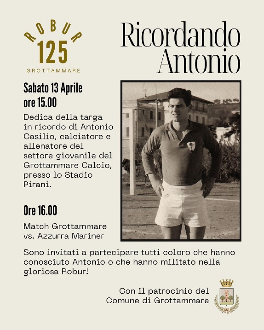 Si tratta di un’iniziativa fortemente voluta dalla società SSD Grottammare Calcio, in collaborazione con l’amministrazione comunale, come testimonia il presidente biancoceleste Giorgio Rivosecchi: “Quest'anno ricorre il 125 esimo anniversario della nascita della polisportiva Grottammare. Antonio Casilio é stata una delle personalità che nel corso della sua vita si é maggiormente spesa per il bene di questa gloriosa società. Sarà un’occasione per ricordarlo e incontrarci con tutti gli amici che hanno condiviso con lui questo percorso”. Messaggio ribadito anche dal Sindaco Alessandro Rocchi, insieme al vicesindaco Lorenzo Rossi e al consigliere comunale Nicolino Giannetti: “Ci sembra doveroso unirci alla proposta da parte del Grottammare Calcio di ricordare Antonio Casilio: una personalità che ha dato tanto alla nostra comunità, in campo come calciatore e fuori dal campo insegnando i valori dello sport alle nuove generazioni. Antonio ha creduto nel calcio come specchio di una società migliore, più inclusiva, attenta alla questione sociale. La sua memoria è cara alla nostra comunità e rappresenta un esempio costante di impegno per il sociale”.