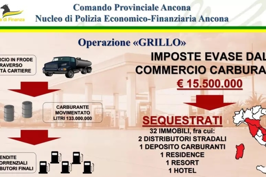 L'imponente frode fiscale avrebbe riguardato l'approvvigionamento illecito e la vendita di oltre 133 milioni di litri di carburante, producendo, in pochi anni, presunti profitti illeciti per l'organizzazione criminale per oltre 15 milioni di euro. Oggi, i finanzieri del Comando Provinciale della Guardia di Finanza di Ancona, su delega della Procura di Trani, hanno dato esecuzione, nelle province di Ascoli Piceno, Teramo, Pescara, Barletta, Pistoia, Reggio Emilia e Sassari a un articolato provvedimento cautelare emesso dal gip di Trani, su richiesta della Procura di Trani. E' stato disposto il sequestro preventivo, anche nella forma per equivalente, di disponibilità e beni fino alla concorrenza di 15,5 milioni di euro. Sigilli su 32 unità immobiliari, tra cui due distributori stradali ubicati in provincia di Teramo, un deposito di carburanti in provincia di Reggio Emilia, un resort situato nel Comune di Arzachena, località Baia Sardinia (Sassari), un residence ubicato in provincia di Teramo, e svariati appartamenti di pregio e terreni ubicati in province italiane.
