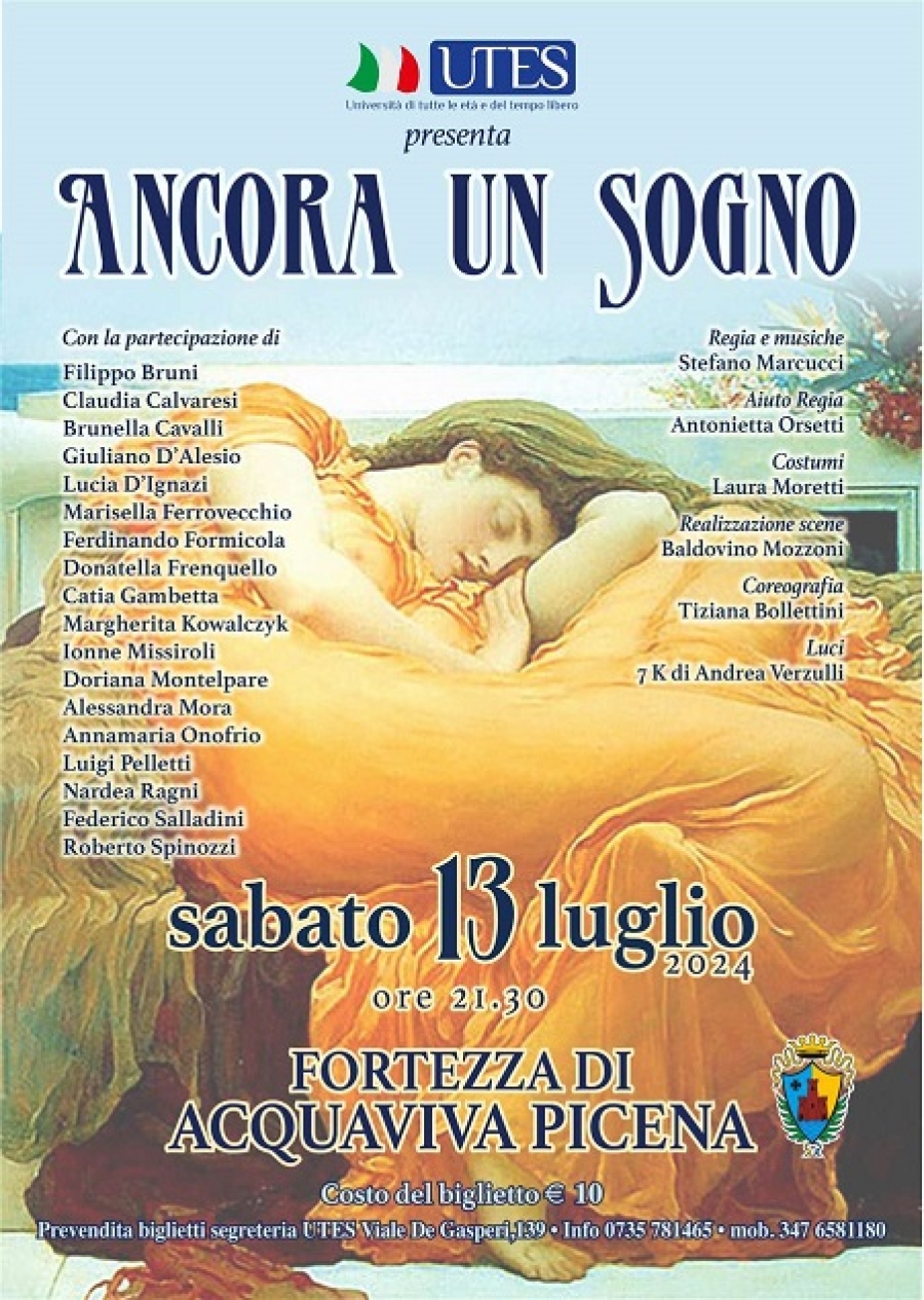 oltre alla splendida cornice della Palazzina Azzurra, centro nevralgico dell’estate sambenedettese, dove il 6 luglio è previsto il concerto della Band Utes che avrà come prezioso corollario l’esibizione delle allieve dei corsi di Aerobica e di Danza del Ventre. Altri eventi sono previsti a Grottammare in Piazza Kursaal, dove l’11 luglio sarà replicato “Utes Story”, uno spettacolo contenitore, in cui è prevista l’esibizione di tutti gli allievi e dei maestri che hanno dato vita ai laboratori delle varie danze e delle attività motorie, Il 13 luglio nella splendida cornice della Fortezzza Medievale di Acquaviva Picena il Gruppo Teatrale dell’Utes proporrà la replica di “Ancora un sogno”, uno spettacolo teatrale liberamente tratto da “Sogno di una notte di mezza estate” di Shakespeare. Il 14 luglio nella medesima location si esibirà il gruppo di Danze tradizionali Malafe’ Danza con lo spettacolo Lune’, corpi in movimento