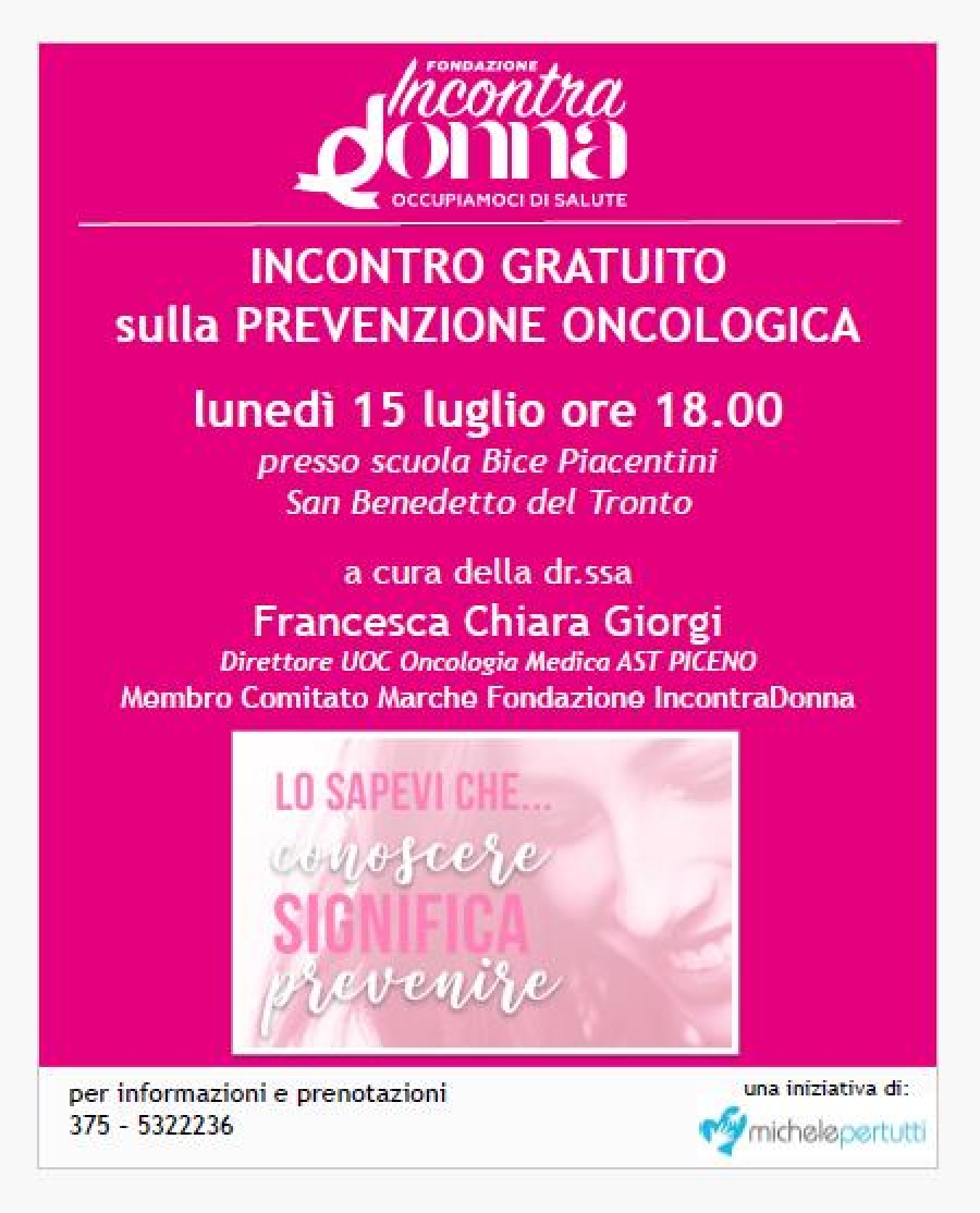 San Benedetto – Lunedì 15 luglio presso la scuola Bice Piacentini dalle ore 18:00 l’appuntamento è con la prevenzione del tumore al seno grazie alla collaborazione con Fondazione IncontraDonna e Michelepertutti.