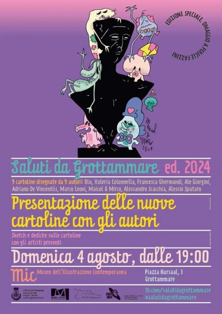 Eventi espositivi e presentazione delle cartoline 2024 di Saluti da Grottammare nell’edizione speciale dedicata a Pericle Fazzini da otto disegnatori italiani e il writer BLU.