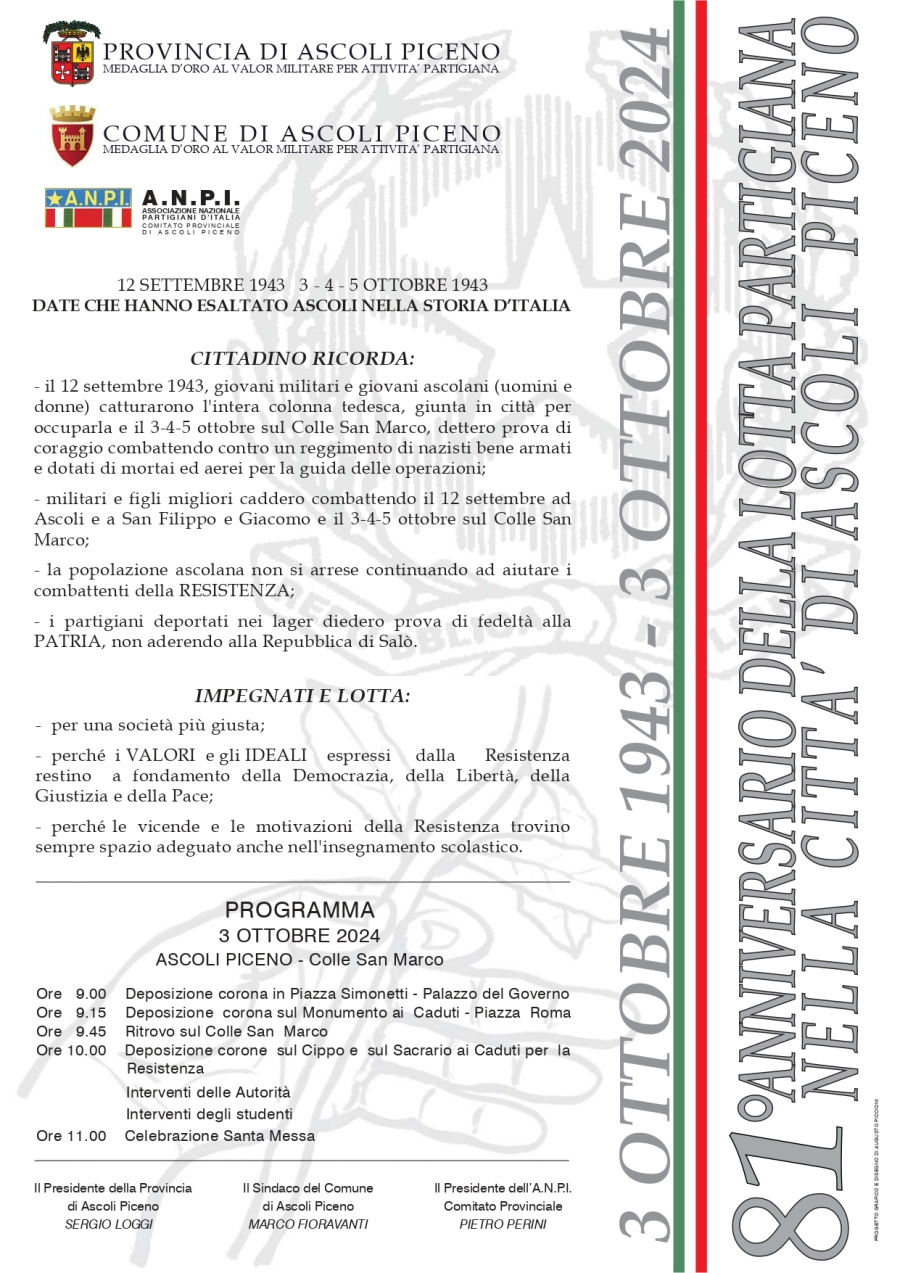 Il programma delle Celebrazioni del 3 Ottobre Giovedì 3 ottobre si svolgerà la celebrazione dell’81° anniversario dell’inizio della lotta di liberazione in Ascoli Piceno.