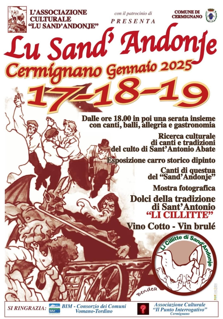 Una tradizione che si rinnova da ormai oltre trent’anni con la ricerca culturale dei canti di questua e dei riti legati al culto del santo protettore degli animali e dei contadini: gruppi folkloristici itineranti, musici e teatranti rievocheranno nella tre-giorni le tentazioni dell’Eremita e l’eterna lotta tra il bene e il male, con canti, balli, allegria e buona gastronomia per le vie del borgo, a partire dalle ore 18. A completare il programma la mostra dei caratteristici carri dipinti recanti l’effige del santo, la mostra fotografica allestita in Sala Consiliare e i caratteristici dolci della tradizione, “Li cillitte”, che si potranno degustare accompagnati da vino cotto e vini tipici locali. L’evento, con inaugurazione venerdì alle 18, è promosso dall’Associazione culturale “Lu Sand’Andonje” con il patrocinio del Comune di Cermignano e del Consorzio BIM ed è stato presentato questa mattina al Bim in conferenza dal sindaco Danilo Del Cane e dal presidente dell’associazione “Lu Sand’Andonje”, Benito De Angelis. Tra gli obiettivi della manifestazione, realizzata anche in collaborazione con l’associazione culturale “Il punto interrogativo”, è promuovere la filiera artigianale di produzione dei dolci tipici locali, gli uccelletti, che richiamano tratti fondamentali della devozione sviluppatasi nei secoli nei confronti del santo: gli animali e il canto, rigorosamente preparati e decorati a mano dalle donne del paese, secondo un’antica ricetta che si tramanda di generazione in generazione. Nella tre-giorni saranno proposti menù a base dei prodotti tipici della tradizione contadina negli stand al coperto, allestiti dalle ore 18 alle 2 del mattino. In caso di maltempo la manifestazione si svolgerà nel fine settimana successivo.
