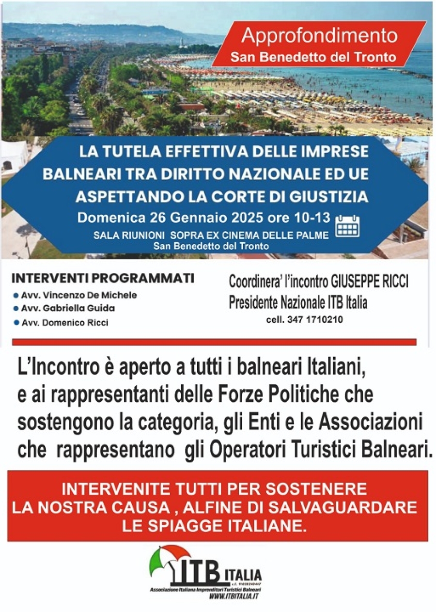 San Benedetto - Domenica 26 Gennaio 2025 dalle ore 10,00 alle 13,00 presso la SALA RIUNIONI sopra EX CINEMA DELLE PALME San Benedetto del Tronto incontro sul tema "LA TUTELA EFFETTIVA DELLE IMPRESE BALNEARI TRA DIRITTO NAZIONALE ED UE ASPETTANDO LA CORTE DI GIUSTIZIA".