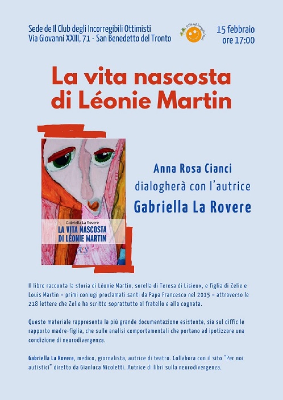 San Benedetto - Sabato 15 febbraio alle ore 17,00 presso la sede del "Il Club degli incorreggibili ottimisti" in via Giovanni XXIII, 71 presentazione del libro "La vita nascosta di Lèonie Martin" di Gabriella La Rovere.