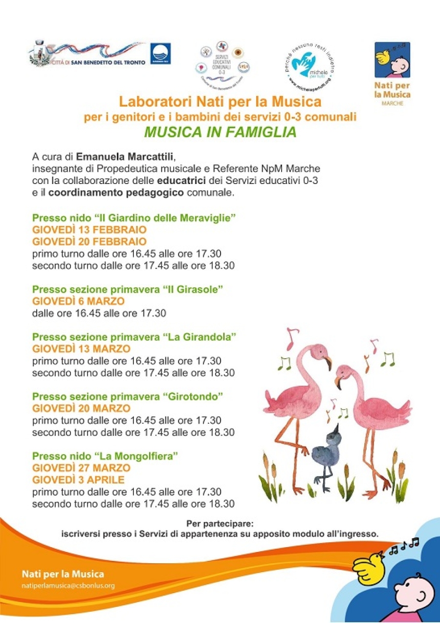 Al via da domani, giovedì 13 febbraio, per protrarsi fino ad aprile, il progetto gratuito “Musica in famiglia”, accreditato dal programma “Nati per la Musica nazionale”, presso i servizi per i genitori e i bambini dei nidi comunali “Il Giardino delle Meraviglie”, “La Mongolfiera” e le sezioni primavera comunali “Girandola”, “Girotondo”, “Girasole” con l'insegnante di propedeutica musicale e referente di “Nati per la Musica- Marche”, Emanuela Marcattili, in collaborazione con l’associazione “Michelepertutti Onlus”. Il progetto si propone lo scopo di favorire la relazione fra bambino ed adulto di riferimento attraverso lo strumento della musica, che risulta essere quel primo canale comunicativo privilegiato che, a sua volta, anticipa la comunicazione con la lingua, perché "parla" direttamente e immediatamente attraverso il canale delle emozioni. “Fare ed ascoltare musica” al Nido e alla sezione Primavera per il bambino rappresenta una grande opportunità educativa e fonte di benessere, non solo per la sua crescita globale, ma per gettare le basi della comunicazione - relazione con i pari e l’adulto di riferimento, genitore o educatore. Particolare soddisfazione esprime l’assessore alle Politiche Sociali del Comune di San Benedetto del Tronto, Andrea Sanguigni: “L’iniziativa riconosce il valore educativo espressivo -relazionale indiscusso della musica, proposta ai bambini, fin dai primi anni di vita. Dopo la formazione sugli stessi laboratori musicali, svolta con alto gradimento dal personale educativo comunale nei giorni scorsi, l’auspicio è che le attività che verranno proposte con tali laboratori tra genitori e figli possano essere replicate con continuità anche a casa, oltreché proposte all’interno dei servizi 0-3, per il valore aggiunto di una concreta continuità educativa”.