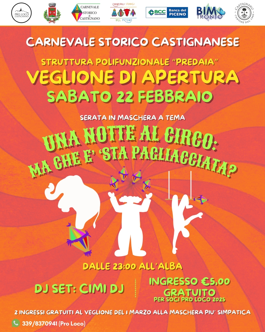 Ma che è sta pagliacciata?” un invito a entrare in un mondo fatto di magia, spettacolo e fantasia senza limiti. E allora spazio a creatività e simpatia! Clown e domatori, trapezisti e marionette, animali e tutto quello che verrà in mente: insomma inventiva sarà la parola d’ordine della serata. E perché no: anche per provare a vincere il concorso per la maschera più originale/simpatica, con in ballo 2 biglietti omaggio per l’ingresso al Veglionissimo di Carnevale in programma sabato 1 marzo. Sarà l’occasione perfetta per dare vita a un circo fuori dal comune, per divertirsi insieme, brindare, ballare tutta la notte e scaldare i motori di questa edizione 2025 dello storico Carnevale di Castignano. La musica sarà a cura di Cimi Dj e il costo dell’ingresso sarà di 5€ (gratuito per i soci Pro Loco Castignano 2025), con possibilità di prenotare anche tavoli al prezzo di 10€ contattando su whatsapp il numero 339/8370941 (cellulare Pro Loco). L’originalità dei temi, sempre diversi e ricercati per questo veglione inaugurale, ed il clima festoso e sempre accogliente prodotto dei castignanesi, legati da una eterna passione a questo periodo dell’anno e alla loro tradizione, sono gli ingredienti ottimali per prevedere una grande serata all’insegna del divertimento e per festeggiare nel migliore dei modi l’inizio del Carnevale, che proseguirà poi nel suo ricco programma fino a Martedì grasso, 4 marzo.