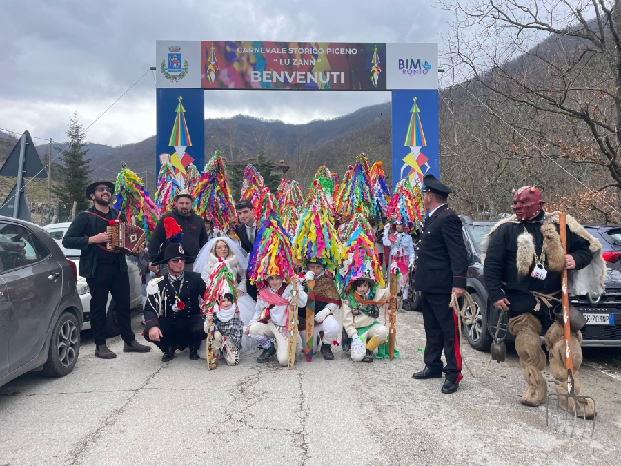 Nonostante il meteo incerto, questa mattina è andato in scena il caratteristico corteo degli Zanni, maschera tipica dei piccoli borghi piceni di Pito, Pozza e Umito. Gli Zanni, con i loro alti copricapi ricoperti di strisce colorate e la spada, detta staiola, che rappresenta le due facce del bene e il male, sono partiti da Pito, per l’appunto, attraversando le varie frazioni del territorio e concludendo il proprio percorso nella piazza di Pozza. Lo Zanni era un personaggio del teatro comico dell’antica Roma, in seguito divenuto maschera della commedia dell’arte. Il nome di Zanni, come Zuan, è una versione veneta del nome Gianni, un nome molto diffuso nel contado veneto-lombardo. C’è chi sostiene infatti che i maestri comacini lombardi, arrivati nei paesi intorno ad Ascoli per lavorare il travertino, abbiano importato tale maschera. Ad aprire il corteo sono stati il diavolo e il carabiniere, seguiti dai suonatori di organetto e dalla coppia di sposi per fare spazio al vero protagonista del Carnevale acquasantano: il gruppo degli ‘Zanni’. Una sfilata, quella di ieri, al ritmo di musica e balli, con il gruppo che si è fermato di tanto in tanto ai vari banchetti esposti dagli abitanti delle frazioni. Nove le tappe della sfilata: Forcella, U Colle, Faeta, I Castiù, Cimitero Partigiano, Cavata, Fadù, Ponte delle Framiche e San Vengenze. Presenti anche tanti visitatori.