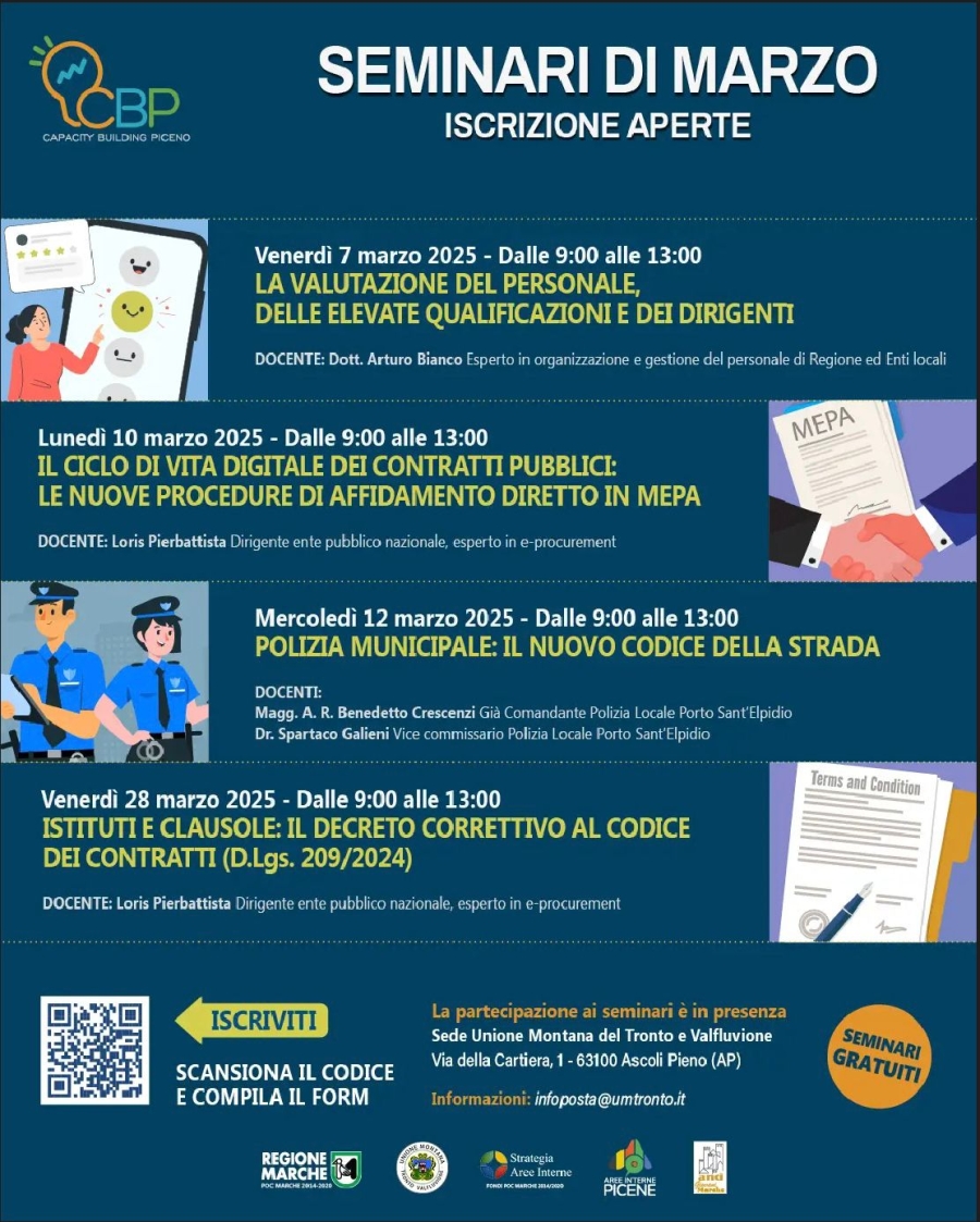 Ascoli Piceno, 06/03/2025 – 7, 10, 12 e 28 marzo. Sono queste le date previste per la formazione gratuita per le Aree Interne Picene, presso l’Unione Montana del Tronto e Valfluvione, ad Ascoli Piceno. Gli eventi rientrano in “Capacity Building Piceno”, iniziativa di formazione gratuita finalizzata al rafforzamento della capacità amministrativa del territorio delle Aree Interne Picene, e promossa dall’Unione Montana del Tronto e Valfluvione, sostenuta dalla Regione Marche (con Fondi POC Marche 2014-2020), nell’ambito della Strategia Nazionale Aree Interne (SNAI) di Ascoli Piceno. La partecipazione alla formazione è sempre in presenza e gratuita ma è necessario iscriversi al seguente link: https://forms.gle/ALnGtvaP3LVKwCPdA Il 7, il 10, il 12 e il 28 marzo si parlerà di valutazione personale, Mepa, nuovo codice della strada, decreto correttivo al codice dei contratti. Quattro seminari formativi, dunque, tutti all’Unione Montana del Tronto e Valfluvione e tutti nel medesimo orario: dalle 9 alle 13. Cambiano però ogni volta gli argomenti – attualissimi e utili per chi opera nelle aree interne – e i docenti, sempre esperti indiscussi dei rispettivi settori di competenza. Di seguito lo specifico delle mattinate di formazione. Venerdì 7 marzo – dalle ore 9 alle 13, per approfondire “La valutazione del personale, delle elevate qualificazioni e dei dirigenti”. Docenza affidata a dott. Arturo Bianco, esperto in organizzazione e gestione del personale di Regione ed Enti Locali. Lunedì 10 marzo – dalle ore 9 alle 13, per parlare di “Ciclo di vita digitale dei contratti pubblici: le nuove procedure di affidamento diretto in Mepa”, con Loris Pierbattista, dirigente ente pubblico nazionale, esperto in e-procurement. Mercoledì 12 marzo – dalle ore 9 alle 13, con un seminario dedicato a “Polizia Municipale: il nuovo codice della strada”. Docenti: Magg. A. R. Benedetto Crescenzi, Già Comandante Polizia Locale Porto Sant’Elpidio e Dr. Spartaco Galieni, Vice commissario Polizia Locale Porto Sant’Elpidio. Venerdì 28 marzo – dalle ore 9 alle 13, con l’ultima mattinata di formazione di marzo dedicata a “Istituti e clausole: il decreto correttivo al codice dei contratti (D.Lgs. 209/2024)”, con Loris Pierbattista, dirigente ente pubblico nazionale, esperto in e-procurement.