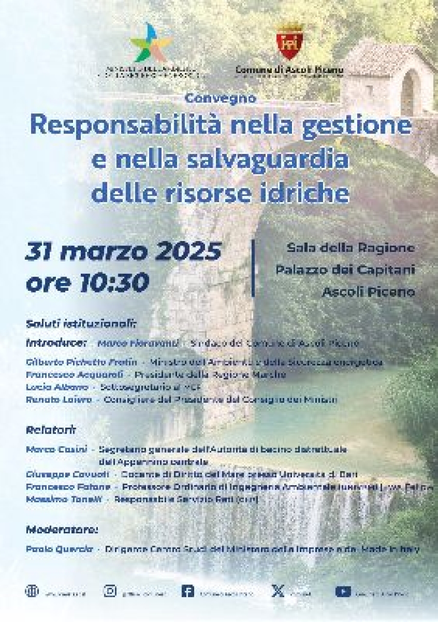 e per una gestione sicura e responsabile. Il patrimonio idrico, quale bene comune, è un fattore determinante per lo sviluppo sostenibile, per la salute, la prosperità delle persone e per il benessere del pianeta. Nell’ambito della settimana celebrativa è stato organizzato un incontro di divulgazione che si terrà il 31 marzo p.v.. a partire dallo ore 10.30 presso la sala della Ragione a Palazzo dei Capitani, dal titolo “Responsabilità nella gestione e nella salvaguardia delle risorse idriche”, rivolto anche alla formazione della cittadinanza ascolana e dei Comuni del territorio, per promuovere l’uso consapevole delle acque, l’utilizzo efficiente e rispettoso dei beni ambientali, creare opportunità significative in ambito socio-economico. Durante l’incontro, che ha ottenuto il patrocinio del Ministero dell'Ambiente e della Sicurezza energetica, sarà trasmesso il video messaggio del Ministro dell’Ambiente, Prof. Dott. Gilberto Pichetto Fratin. Seguiranno i saluti istituzionali del Sindaco Marco Fioravanti, del Presidente della Regione Marche, Francesco Acquaroli, del Sottosegretario al MEF, Lucia Albano, e del Consigliere del Presidente del Consiglio dei Ministri, Renato Loiero. A seguire, gli interventi dei relatori Marco Casini (Segretario generale dell'Autorità di bacino distrettuale dell'Appennino centrale), Giuseppe Cavuoti (Docente di Diritto del Mare presso l'Università di Bari), Francesco Fatone (Professore ordinario di Ingegneria ambientale Univpm e IWA Fellow) e Massimo Tonelli (Responsabile Servizio reti Ciip).Moderatore dell'incontro sarà Paolo Quercia, Dirigente Centro studi del Ministero delle imprese e del Made in Italy. https://www.comune.ap.it/flex/cm/pages/ServeBLOB.php/L/IT/IDPagina/25638