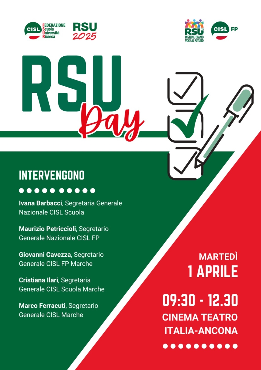 ~ “RSU Day”, l’evento promosso dalla CISL Scuola Marche e dalla CISL FP Marche in vista delle prossime elezioni delle Rappresentanze Sindacali Unitarie (RSU) nel settore pubblico e nella scuola. All’incontro interverranno:~Ivana Barbacci,~Segretaria generale della CISL Scuola, e~Maurizio Petriccioli, Segretario generale della CISL FP. Insieme a loro interverranno~Cristiana Ilari, Segretaria generale CISL Scuola Marche,~Giovanni Cavezza, Segretario generale CISL FP Marche, e il Segretario generale della CISL Marche~Marco Ferracuti. L’iniziativa rappresenta un momento di confronto e approfondimento sul ruolo delle RSU nei luoghi di lavoro, sulla contrattazione collettiva e sulla tutela dei diritti delle lavoratrici e dei lavoratori del pubblico impiego e del comparto istruzione. Le elezioni RSU si svolgeranno nei giorni 14, 15 e 16 aprile 2025, come previsto dal protocollo sottoscritto il 20 novembre 2024. Ogni tre anni, i lavoratori sono chiamati a eleggere i propri rappresentanti, che svolgeranno un ruolo chiave nella difesa dei diritti e nella contrattazione. Le operazioni di scrutinio si concluderanno il 17 aprile, mentre i risultati definitivi saranno pubblicati entro il 24 aprile 2025. La CISL invita tutti i lavoratori a partecipare attivamente, sottolineando l’importanza di una rappresentanza sindacale forte, radicata e competente.