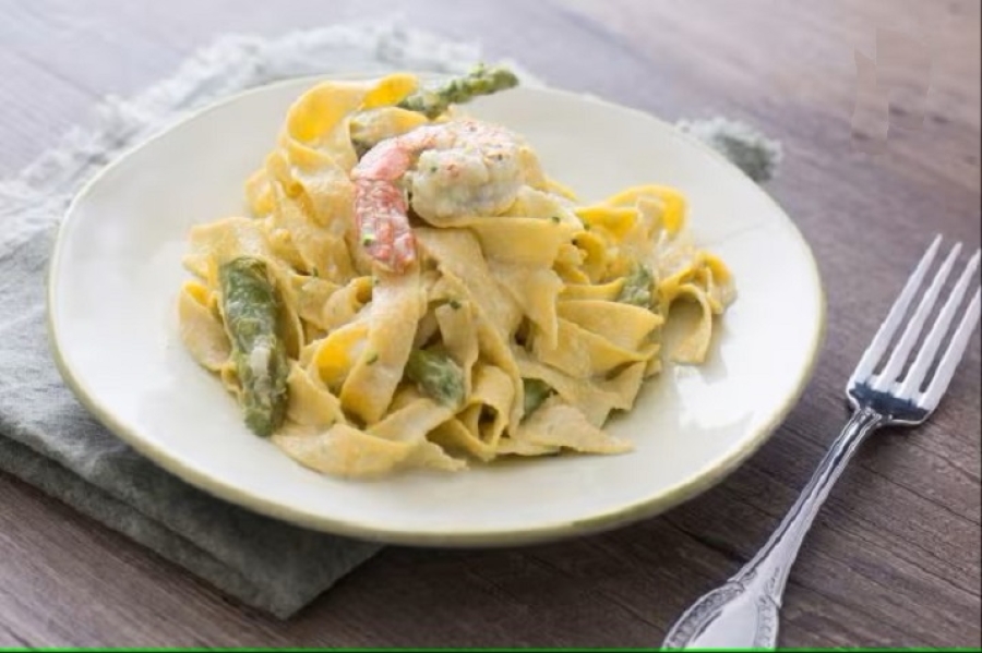 Tagliatelle con gamberi rosa e asparagi (sabato, domenica)