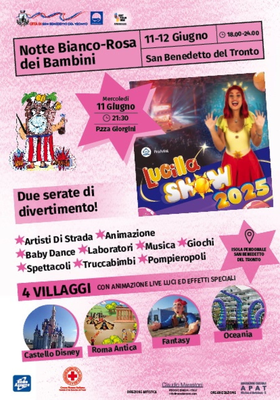 Lucilla è la reginetta della baby dance, con oltre seicento milioni di visualizzazioni su You Tube e centinaia di migliaia di follower sparsi ovunque sul web, dove la cantante è un’autentica star. La presenza di Lucilla, oltre a essere un richiamo fortissimo per tutti i bambini, è anche un importante segnale sociale, poiché le sue canzoni e i suoi video animati sono spesso il primissimo approccio dei bambini con la musica, stimolando il coordinamento psicomotorio, la socializzazione e tantissimi altri concetti utili per il loro sviluppo. L’esibizione di Lucilla è prevista alle 21.30 di mercoledì 11 giugno, mentre la serata successiva sarà aperta da una band formata da 15 elementi e specializzata in baby dance e sul palco si esibiranno anche Dj, coro e "Mamme in canto". Un’altra interessantissima novità dell’evento è rappresentata dalla presenza di quattro nuovissimi villaggi con animazione live, luci ed effetti speciali tra cui il grande "braccia-aperte" con scenografia e allestimento, il castello ispirato ai cartoni animati di Walt Disney, il villaggio di Roma Antica con tutta l’adeguata animazione a tema e il mondo sottomarino che riporterà al film Oceania. L’interessante contorno alla notte “Bianco-Rosa dei bambini” sarà formato da Pompieropoli, l’attività specifica di mercoledì 11 rivolta ai più piccoli a cura dell’associazione nazionale Vigili del fuoco, mentre giovedì 12 spazio al PicenAmbiente Kids’ Village con il Team Kaos Party che garantirà tante attrazioni e tanto divertimento per i più piccoli. Inoltre, ci saranno le prove di sicurezza stradale con la Croce Rossa Italiana e ancora Dottor clown, truccabimbi, scenografie, area cinofila per adozioni e informazioni contro il randagismo, in collaborazione con la Lega del Cane, il gonfiabile di Radio Azzurra e la divertente “Ruota della fortuna” di Caffè Mokambo. Collaborano all’evento anche Wall Street English, Emilcar, Jack Burger e Natural Trainer.