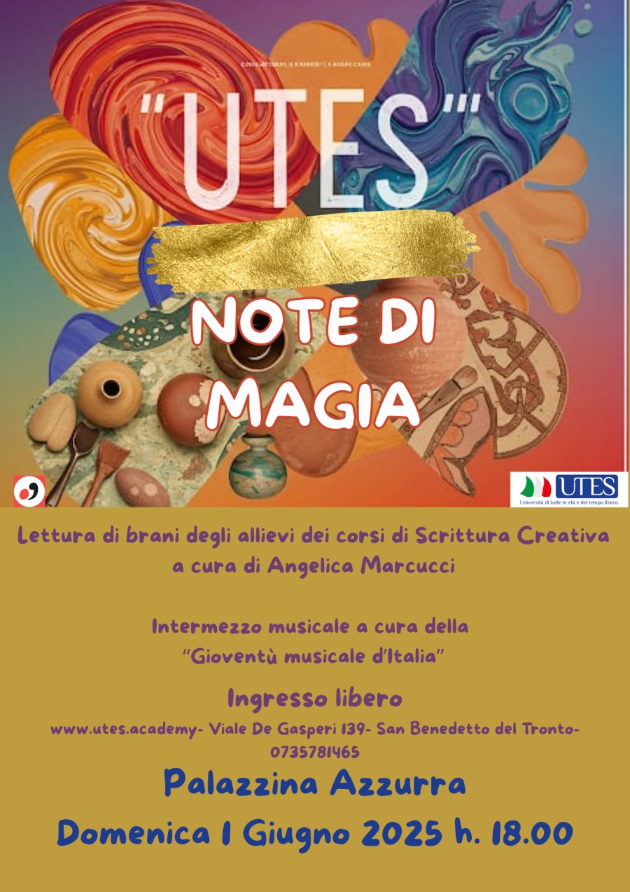 L'ingresso è libero e aperto a tutti. "Note di Magia" offrirà al pubblico l'opportunità di immergersi nelle opere degli allievi dei corsi di Scrittura Creativa. La lettura dei brani sarà curata da Angelica Marcucci,docente UTES, promettendo un' esperienza emotiva e coinvolgente attraverso le voci e le storie emergenti. L'evento sarà arricchito da un intermezzo musicale a cura di "Gioventù Musicale d'Italia", che con le sue note creerà un'atmosfera magica e accompagnerà il viaggio letterario. "Siamo entusiasti di presentare "Note di Magia", un';occasione per mettere in luce il talento e la passione dei nostri allievi di Scrittura Creativa", afferma la presidente Diana Lanciotti Zoboletti. "Insieme alla musica di "Gioventù Musicale d'Italia", crediamo che questo evento sarà un momento di ispirazione e bellezza per tutta la comunità". Vi aspettiamo!