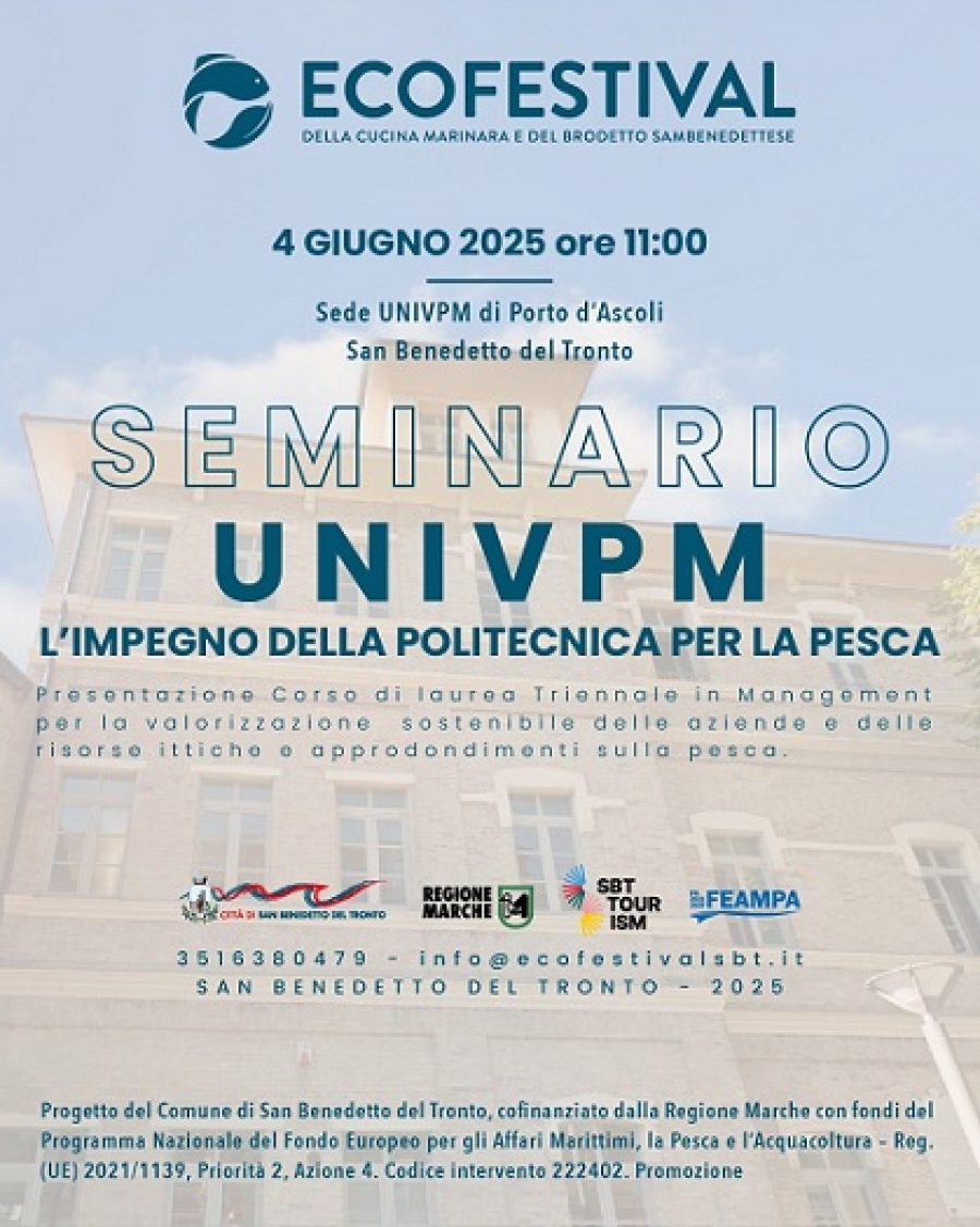Durante il seminario sarà presentato il corso di laurea triennale in “Management per la valorizzazione sostenibile delle aziende e delle risorse ittiche”, già attivato per l’anno accademico 2024-2025 presso il Palazzo Vannicola di San Benedetto del Tronto. Si tratta di un’offerta formativa unica nel panorama universitario italiano, progettata per formare professionisti in grado di affrontare le sfide della gestione sostenibile della filiera ittica e dell’acquacoltura. Il corso nasce da una collaborazione tra il Ministero dell’Agricoltura, della Sovranità alimentare e delle Foreste (MASAF) e l’Università Politecnica delle Marche, con il pieno sostegno del Comune di San Benedetto del Tronto, che considera questa iniziativa strategica per la crescita del territorio e lo sviluppo di competenze innovative nel settore ittico. Il seminario del 4 giugno sarà un’occasione concreta per conoscere da vicino questa nuova proposta formativa e vedrà la partecipazione di esperti provenienti dal mondo scientifico, istituzionale e produttivo, che offriranno spunti e riflessioni su innovazione, sostenibilità e formazione nella gestione delle risorse marine. L’iniziativa rientra tra le attività dell’EcoFestival della Cucina Marinara e del Brodetto Sambenedettese, promosso dal Comune di San Benedetto del Tronto e cofinanziato dalla Regione Marche, nell’ambito del Programma Nazionale del Fondo Europeo per gli Affari Marittimi, la Pesca e l’Acquacoltura – Reg. (UE) 2021/1139 – Priorità 2, Azione 4 – Codice Intervento 222402 – Promozione. Il festival propone un ricco calendario di eventi volti a valorizzare i prodotti ittici locali attraverso percorsi educativi, gastronomici e culturali, rafforzando il legame fra territorio, sostenibilità e innovazione. L’ingresso è libero e aperto a tutti gli interessati. Per informazioni e aggiornamenti: www.ecofestivalsbt.it telefono 351 638047.