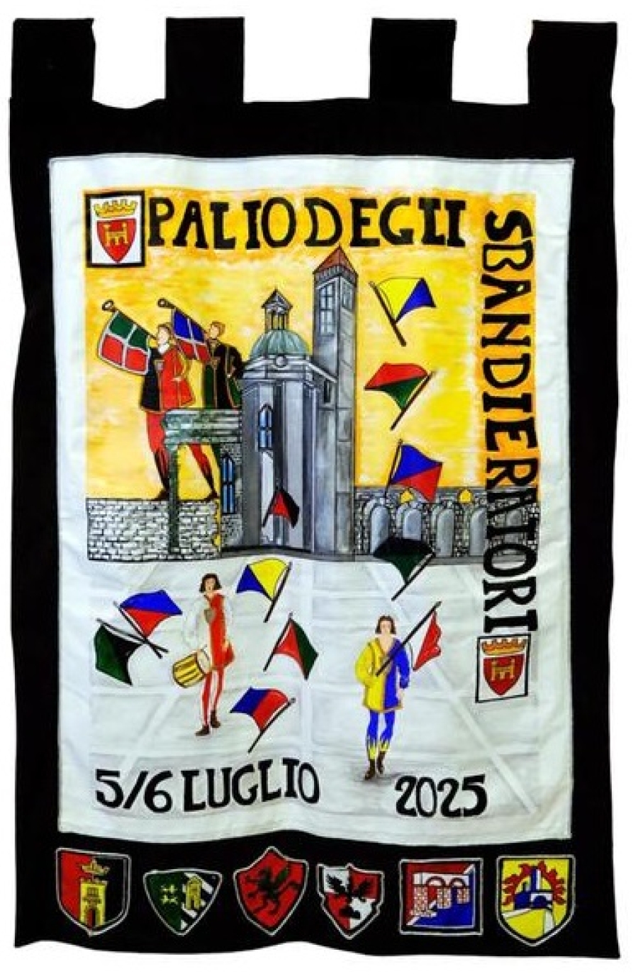 Lo ha realizzato l'artista ascolano Gabriele Viviani che, dopo aver attentamente studiato l'iconografia della tavola trecentesca di Francescuccio di Cecco Ghissi conservata nella chiesa di sant'Agostino, ha elaborato una immagine di grande suggestione che vede al centro la figura solenne della Vergine sotto il cui mantello azzurro trovano riparo i cavalieri giostranti. "Dal cielo cadono gocce di sangue purpureo che simboleggiano i mali dell'umanità dai quali la protezione della Madonna preserva coloro che le sono fedeli ed in questa scelta iconografica l'artista mostra di essersi ispirato alle tavole quattrocentesche raffiguranti la Madonna della Misericordia che protegge dai flagelli provenienti dal cielo quanti si riparano sotto il suo manto" ha spiegato il professor Stefano Papetti, curatore delle collezioni comunali di Ascoli Piceno. "La pace - ha aggiunto - è richiamata dal volo delle colombe che rappresentano il focus della composizione, esprimendo così l'esigenza di giungere ad una tregua nei molti conflitti che in questi anni sono scoppiati in varie zone del mondo, mettendo a rischio l'incolumità dell'intera umanità esposta ai rischi di una escalation militare che sembra sfuggire di mano ai potenti della terra". L'autore, Gabriele Viviani, illustrando il palio di luglio lo ha presentato come "un grande manto che idealmente avvolge, come solo una Madre sa fare, un'intera comunità, quella ascolana, in cui traspare la Chiesa di Sant'Agostino, che si staglia come una Porta Santa, piena di luce, di fronte ai cavalieri che, nel competere per il Palio, non compiono solo una corsa". I ragazzi della Cooperativa Ama Aquilone hanno invece realizzato il palio delle gare degli sbandieratori in programma stasera e domani sera, 6 luglio.