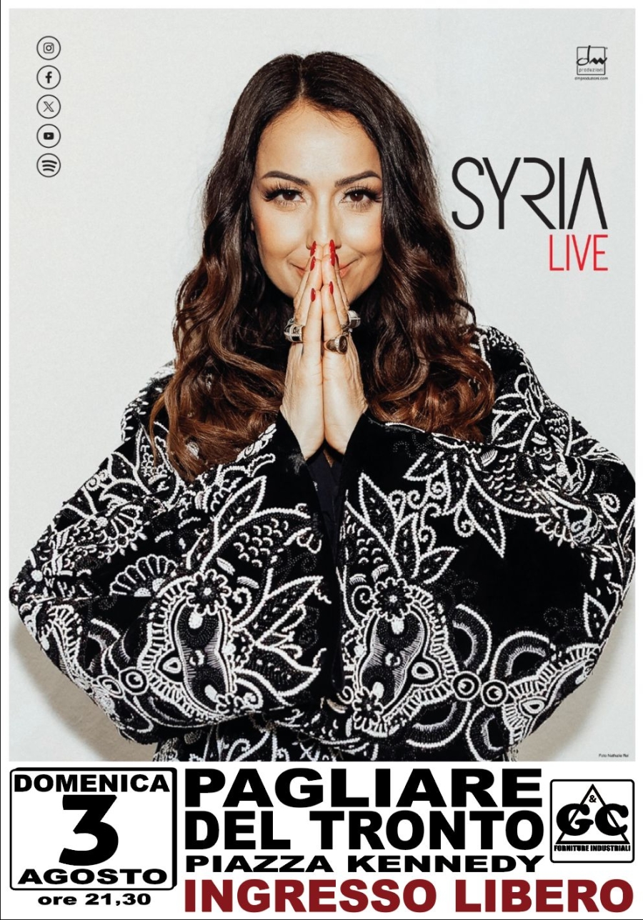 SPINETOLI - Domenica 3 agosto alle ore 21:30, Piazza Kennedy a Pagliare del Tronto si accenderà con la voce e l’energia di Syria,