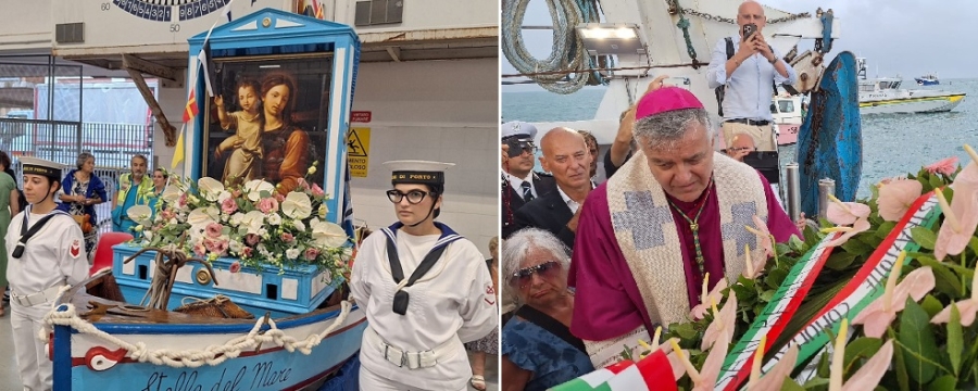 Come consuetudine la flotta dei motopescherecci si è staccata dal Molo Sud cittadino solcando l'Adriatico esattamente qualche minuto dopo le 18,00. Apripista la barca “Maros”, titolare del Palio Velico, seguita da numerose altre imbarcazioni, in un corteo sobrio ma partecipato. A bordo, il Vescovo Gianpiero Palmieri e Don Patrizio Spina hanno guidato la recita del Rosario per la Pace, offrendo un momento di raccoglimento profondo, ascoltato anche da molte persone lungo la banchina e sulla riva. Con loro il sindaco Antonio Spazzafumo, l’onorevole Giorgio Fede, l’assessore regionale Andrea Maria Antonini. Ovviamente il maltempo ha condizionato l'iniziale rotta prevista e comunque il corteo di natanti si è fermato all’altezza della Chiesa di San Francesco di Paola a Grottammare, dove si è svolto il toccante lancio in mare delle corone di fiori, gesto simbolico per ricordare tutti i caduti del mare. Durante la navigazione, è stata poi impartita la tradizionale benedizione alla città e alla sua gente di mare. La processione in mare rappresenta il clou dei festeggiamenti in onore della Madonna della Marina che proseguirà domani con il grande spettacolo pirotecnico di mezzanotte a partire dalle ore 24,00.