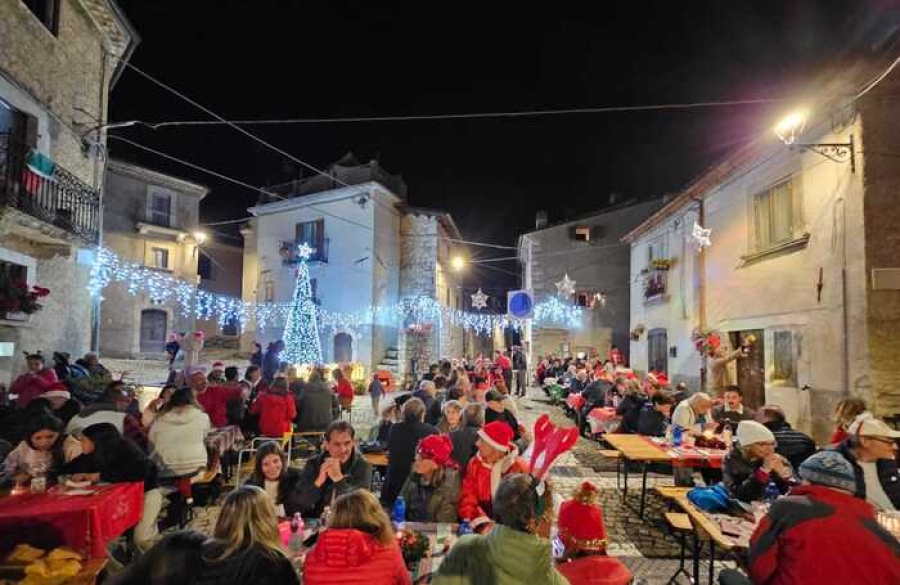È il Natale d'estate andato in scena a Terranera, piccola frazione di Rocca di Mezzo situata a 1.270 metri di altitudine nel cuore del Parco naturale regionale Sirente-Velino. Proprio per le temperature rigide, dal 'sapore' invernale, la Pro Loco ha deciso di organizzare una cena natalizia fuori stagione in piazza, con camino acceso e cappellini d'ordinanza biancorossi. Un'idea nata quasi per gioco, accompagnata da panettone, vin brulè e addobbi in piena regola. Il meteo poi ci ha messo del suo: pioggia, nebbia e temperature serali vicine allo zero hanno fatto il resto, trasformando l'estate abruzzese in una perfetta serata d'inverno. Dalle parti dell'Altopiano delle Rocche, non è poi così raro. Così, tra tovaglie rosse e palline colorate, il paese ha accolto residenti e turisti, moltiplicando per quattro la propria popolazione. Canti di Natale, brindisi e fotografie sotto l'albero "innevato" di condensa hanno contribuito a rendere l'atmosfera ancora più surreale. L'iniziativa, che si ripete ciclicamente per salutare la fine dell'estate, cambia tema ogni anno: nel 2023 sono stati omaggiati i personaggi Disney, mentre nella scorsa edizione protagonista è stata la cultura pop del Duemila.