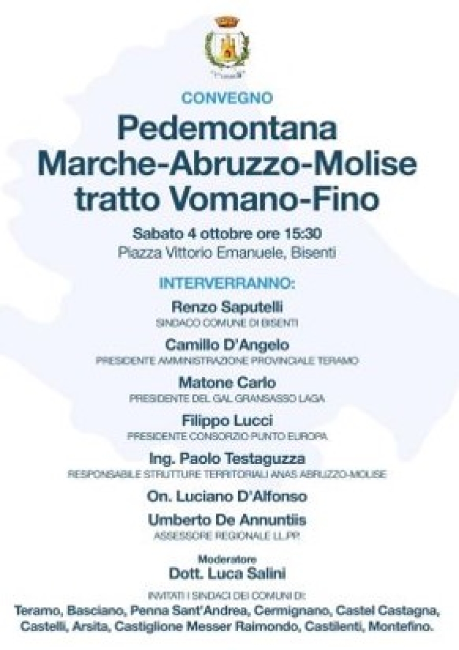 divenuta indispensabile anche per la necessità di decongestionare le vie litoranee in certi momenti impossibili da percorrere per il traffico caotico e sostenuto, è una strada in costruzione, per ora aperta al transito solo in alcuni tratti che, qualora venisse completata, collegherebbe le aree interne della Regione Marche con quelle dell’Abruzzo, fino al Molise. Di viabilità, per l’appunto, si parlerà a Bisenti sabato 4 ottobre alle ore 15:30, presso la Piazza Vittorio Emanuele III, in un convegno dal titolo “Pedemontana Marche – Abruzzo – Molise, tratto Vomano-Fino”, organizzato dal Comune di Bisenti, con spirito di confronto e di partecipazione civica, per sensibilizzare le istituzioni e i cittadini su una tematica di importanza determinante per il comprensorio della Val Fino, con l’auspicio che dall’incontro vengano fuori impegni concreti e precisi per la realizzazione dell’opera assolutamente strategica. Il convegno, moderato dell’Avv. Luca Salini, prevede l’intervento di vari relatori: Umberto D’Annuntiis, Assessore Regionale LL.PP.; Camillo D’Angelo, Presidente della Provincia di Teramo; Luciano D’Alfonso, Deputato della Repubblica Italiana; Renzo Saputelli, Sindaco di Bisenti; Filippo Lucci, Amministratore unico COPE; Carlo Matone, Presidente GAL Gran Sasso -Laga; Paolo Testaguzza, Responsabile Strutture Territoriali ANAS Abruzzo – Molise. Inoltre, sono stati invitati a partecipare tutti i Sindaci dei comuni della Vallata del Fino e dei comuni limitrofi, direttamente o indirettamente coinvolti nella realizzazione della pedemontana. L’appuntamento è a Bisenti per sabato 4 ottobre alle ore 15:30 in Piazza Vittorio Emanuele III.
