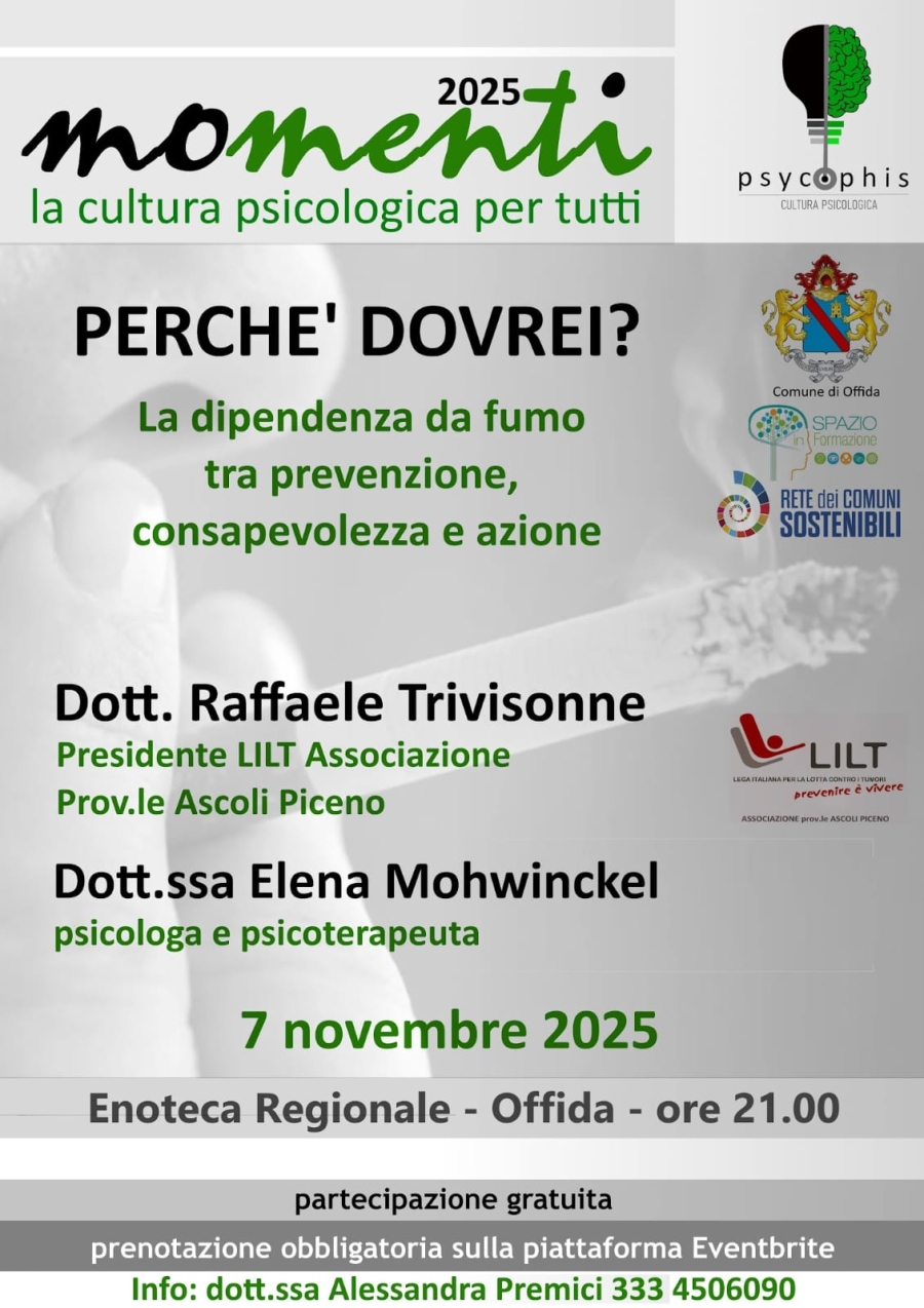 Venerdì 7 novembre, alle ore 21.00, l’Enoteca Regionale di Offida ospiterà una serata dal titolo: “Perché dovrei? La dipendenza da fumo tra prevenzione, consapevolezza e azione”. L’iniziativa, realizzata in collaborazione con LILT - Lega Italiana per la Lotta contro i Tumori, affronterà il tema del tabagismo da una doppia prospettiva: quella sanitaria, legata alle conseguenze fisiche del fumo, e quella psicologica, che indaga i meccanismi emotivi e comportamentali che rendono difficile smettere. A guidare l’incontro saranno: Raffaele Trivisonne, Presidente LILT Associazione Provinciale Ascoli Piceno e la psicologa e psicoterapeuta Elena Mohwinckel. L’incontro avrà un taglio interattivo, con momenti di confronto, stimoli di riflessione e spazio per domande dal pubblico. Obiettivo della serata: informare, sensibilizzare e fornire strumenti utili per comprendere il fenomeno della dipendenza e favorire scelte consapevoli. L’evento è gratuito e rivolto a tutta la popolazione, ma la prenotazione è obbligatoria tramite piattaforma Eventbrite, al link: https://www.eventbrite.it/e/perche-dovrei-tickets-1897323127549?aff=oddtdtcreator