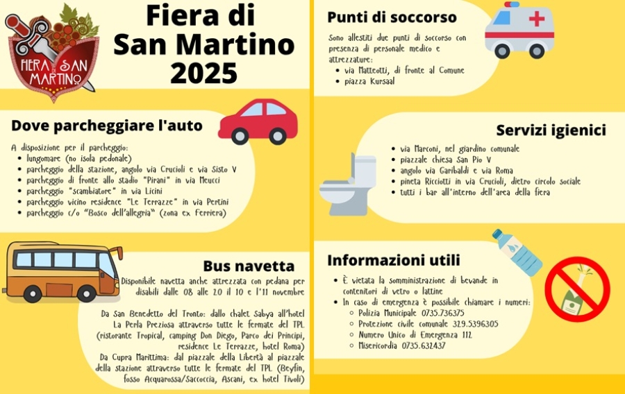 In occasione della tradizionale Fiera di San Martino, in programma nei giorni lunedì 10 e martedì 11 novembre, il Comune di Grottammare ha disposto una serie di misure volte a garantire lo svolgimento in sicurezza della manifestazione e favorire la mobilità sostenibile dei visitatori.