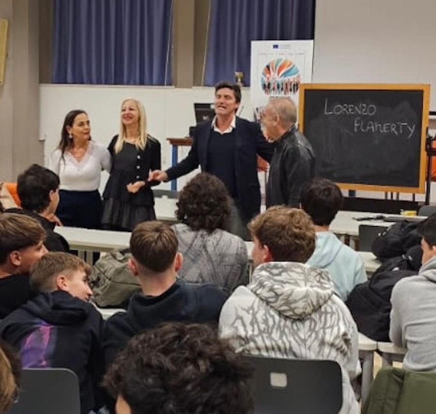 Nell’ambito della sezione Cinema tra i banchi, gli studenti delle classi 3ªB e 3ªD hanno incontrato l’attore Lorenzo Flaherty, protagonista di un dialogo dedicato al rapporto tra cinema, recitazione e intelligenza artificiale. L’iniziativa è stata organizzata grazie al supporto della Dirigente scolastica Elisa Vita, che ha accolto in Aula lettura Flaherty, e della professoressa Silvia Marconi, tutor Formazione Scuola–Lavoro (ex PCTO) della 3ªD; l’appuntamento ha offerto ai ragazzi un’occasione preziosa per riflettere su come le nuove tecnologie stiano cambiando il modo di fare e di vivere il cinema. Flaherty ha saputo conquistare gli studenti con il suo stile diretto e coinvolgente, alternando racconti personali a momenti di improvvisazione sul palco, dove alcuni ragazzi si sono cimentati in brevi scene. Un modo per avvicinarli al cinema non solo come spettacolo, ma come strumento di crescita e scoperta personale. All’incontro ha partecipato anche il sindaco Antonio Spazzafumo, che non ha esitato a unirsi al gioco scenico insieme alla Dirigente e all’attore, in un momento di simpatia molto apprezzato dai presenti. Tra i docenti del Rosetti erano presenti anche le professoresse Sara Tosti, tutor PCTO della 3ªB, Roberta Brandimarte e Valentina Vagnoni. Ad accompagnare Flaherty, il direttore artistico del Piceno Cinema Festival Marco Trionfante, ideatore della rassegna dal 2022, che ha ricordato come il progetto continui a crescere anche grazie alla partecipazione attiva delle scuole del territorio. Durante l’incontro, l’attore ha speso parole bellissime sul Liceo Rosetti, sottolineando con la Dirigente, i docenti e gli studenti di aver percepito una scuola inclusiva, caratterizzata da valori importanti, molto vivace e attenta alle attività culturali; ha inoltre voluto condividere un ricordo personale legato al suo vissuto di studente. “Ho trascorso la mia adolescenza in Inghilterra, dove ho imparato il valore del dialogo con gli insegnanti. Credo profondamente nell’importanza della scuola, sono un genitore molto presente da questo punto di vista e cerco di trasmettere ogni giorno a mio figlio questo messaggio.”