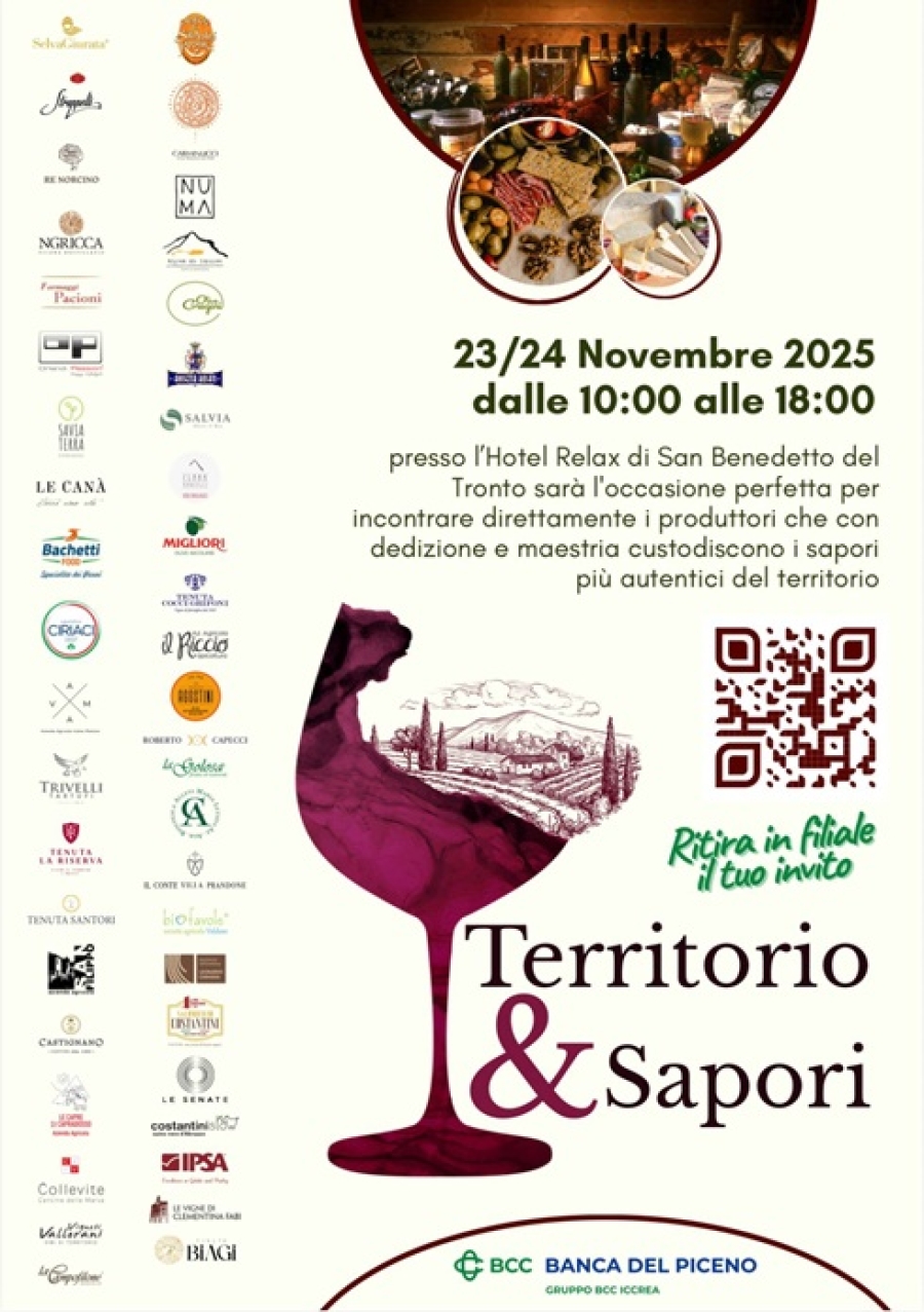 San Benedetto - L’Hotel Relax di San Benedetto del Tronto ospiterà domenica 23 e lunedì 24 novembre “Territorio & Sapori”, iniziativa promossa dalla Banca del Piceno per valorizzare l’eccellenza enogastronomica locale attraverso una due giorni dedicata a soci e clienti.