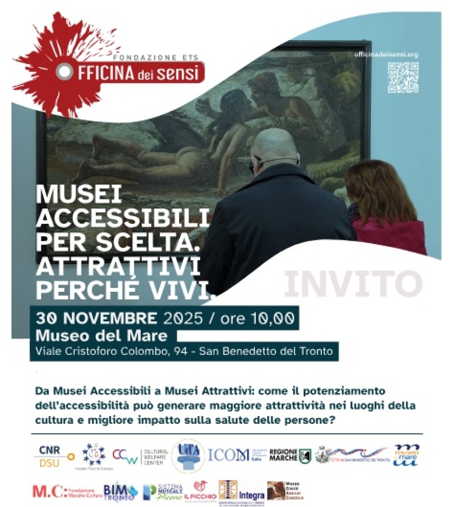 È questo lo spirito che anima l’iniziativa “Da Musei Accessibili a Musei Attrattivi: come il potenziamento dell’accessibilità può generare maggiore attrattività nei luoghi della cultura e migliore impatto sulla salute delle persone?”, in programma domenica 30 novembre 2025 alle 10.00 al Museo del Mare di San Benedetto del Tronto. L’appuntamento, promosso da Fondazione Officina dei Sensi ETS, riunirà studiosi, istituzioni, professionisti e progettisti culturali da tutta Italia per discutere di inclusione, esperienza dei pubblici, impatto sulla salute delle persone e strategia museale. Con l’occasione, verrà presentato il “Manuale di progettazione per l’accessibilità e la fruizione ampliata del patrimonio culturale. Dai funzionamenti della persona ai funzionamenti dei luoghi della cultura”, a cura di Gabriella Cetorelli (CUG MiC) e Luca Papi (CNR DSU) e pubblicato da CNR Edizioni.“L’obiettivo è ambizioso e nel contempo realizzabile – dichiara Mirco Fava, direttore della Fondazione Officina dei Sensi - ripensare i luoghi della cultura affinché diventino spazi vivi, capaci di attrarre persone diverse, generare comunità e favorire la piena partecipazione, anche per chi si trova in condizioni di fragilità. Nel programma della giornata, oltre ai saluti istituzionali, sono previste analisi del contesto italiano e tavole rotonde che proietteranno lo sguardo sulle trasformazioni in corso nei musei contemporanei”.Tra i relatori figurano nomi di primo piano del panorama nazionale: Pier Luigi Sacco, economista della cultura ed esperto di politiche culturali; Gabriella Cetorelli, Esperta in accessibilità e fruizione ampliata del patrimonio UNESCO. Archeologa, Comitato Unico di Garanzia (CUG) - Ministero della Cultura; Luca Papi, Esperto in sicurezza e accessibilità del patrimonio culturale. Ingegnere della Sicurezza e Protezione Civile, Primo Tecnologo del DSU – CNR;.Dino Angelaccio, coadiutore gruppo accessibilità universale dell’Osservatorio Nazionale sulla condizione delle Persone con disabilità – Presidenza del Consiglio dei Ministri; Fabio Fornasari, architetto museologo, esperto in progettazione accessibile; Pier Giorgio Curti, Psicologo Psicoterapeuta. Accanto a loro, docenti universitari, direttori museali, rappresentanti della società civile e delle amministrazioni pubbliche.Un’attenzione particolare sarà riservata agli strumenti per migliorare l’accessibilità immediata degli eventi culturali: interpretariato LIS, sottotitolazione in tempo reale e font ad alta leggibilità garantiranno la possibilità di seguire i lavori anche a chi convive con disabilità sensoriali o difficoltà di lettura.L’evento rappresenta un momento cruciale per riflettere su un sistema museale che, oggi più che mai, è chiamato a essere parte attiva della crescita sociale dei territori. Non solo custode del patrimonio, ma motore di partecipazione, innovazione e welfare culturale.