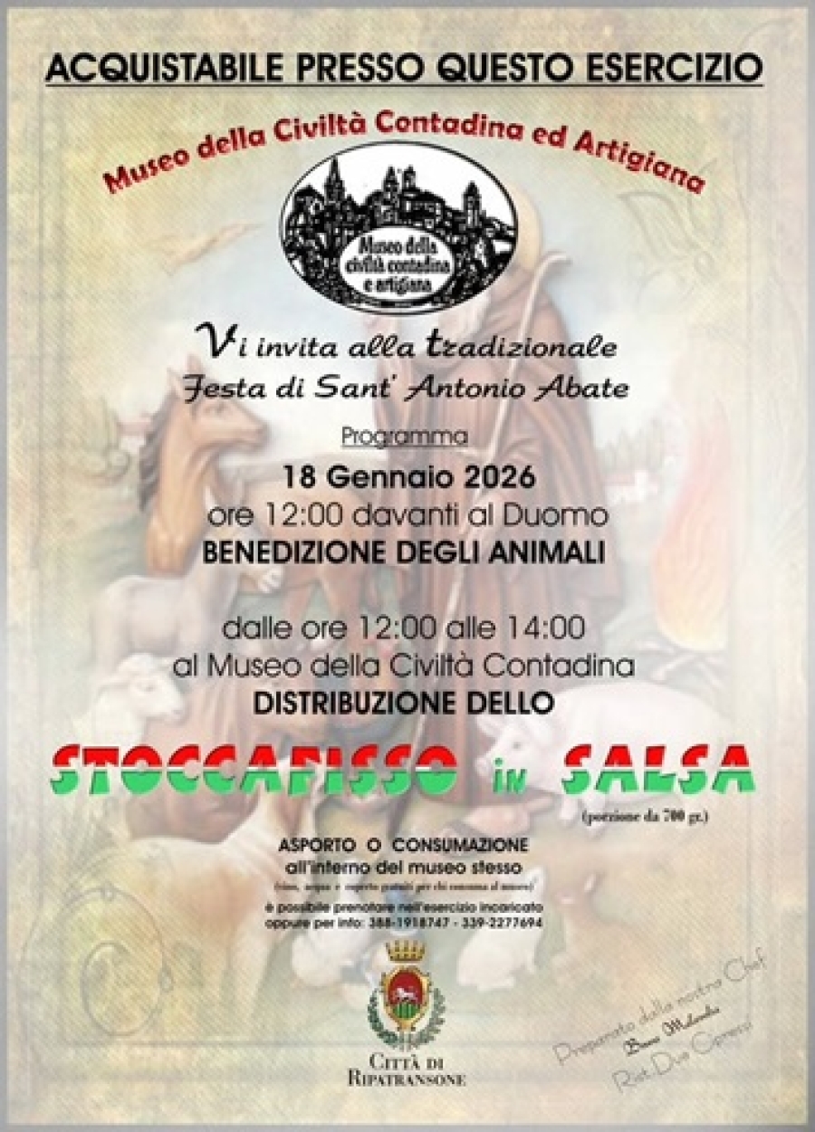 Il Museo della Civiltà Contadina ed Artigiana a Ripatransone invita tutti alla tradizionale Festa di Sant’Antonio Abate 2026 domenica 18 gennaio ore 12,00 davanti al Duomo per la benedizione degli animali.
