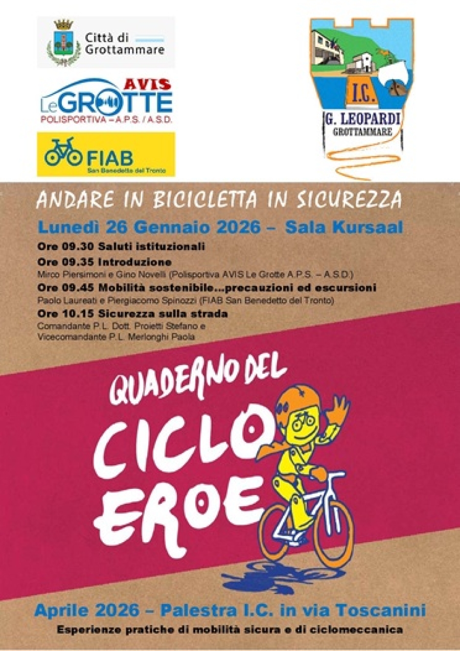 L’iniziativa nasce dalla cooperazione tra la Polisportiva AVIS Le Grotte A.P.S. – A.S.D. (presieduta da Mirco Piersimoni) la FIAB di San Benedetto del Tronto (guidata da Paola Bruni). Queste due associazioni, condividendo i principi di mobilità sostenibile e di sicurezza per i ciclisti, si sono attivate per sviluppare un progetto per supportare la scuola nella promozione dell’uso della bicicletta in sicurezza. Il progetto ha trovato il pieno sostegno della Dirigente Scolastica Dott.ssa Luigina Silvestri e si avvale di una collaborazione istituzionale che vede in prima linea l’Amministrazione Comunale. Una sinergia tra Istituzioni, Scuola e Associazionismo. Il cuore del progetto risiede nella forte collaborazione tra diverse realtà del territorio. Grazie al contributo economico riconosciuto dall’assessore alla Sostenibilità, Salute e Benessere e Tutela del Territorio, Alessandra Biocca, è stato possibile stampare il “Quaderno del Cicloeroe”. Questo opuscolo didattico, curato dalla FIAB, verrà consegnato ad ogni studente per stimolare, attraverso quiz ed approfondimenti, una riflessione consapevole sulla mobilità ciclistica. L’efficacia dell’iniziativa è frutto della collaborazione della Consigliere delegata alle politiche scolastiche Oriana Vitarelli, e dell’impegno della Vice-Preside Prof.ssa Luigina Ceddia. Questa rete tra Associazioni, Scuola e Comune rappresenta il fattore trainante per promuovere la bicicletta non solo come mezzo ecologico, ma come strumento di autonomia e benessere per le le nuove generazioni. Il percorso formativo si articola in due tappe fondamentali: lunedì 26 gennaio (ore 9.30) – sala Kursaal: primo incontro teorico focalizzato sulle regole di comportamento ed i iprincipi della mobilità sostenibile. Interverranno Mirco Piersimoni e Gino Novelli (Polisportiva AVIS Le Grotte), Paolo Laureati e Piergiacomo Spinozzi (FIAB San Benedetto del Tronto), insieme al Comandante della Polizia Locale Dott. Stefano Proietti ed alla Vicecomandante Paola Merlonghi. mese di aprile – palestra di via Toscanini: sessione pratica dove i ragazzi potranno sperimentare sul campo quanto appreso, mettendo in pratica le regole per una guida sicura e cosciente. Il progetto si propone, dunque, come una soluzione concreta per educare i giovani alle buone pratiche ambientali ed alla sicurezza stradale, rendendoli protagonisti attivi della transizione ecologica del proprio territorio.