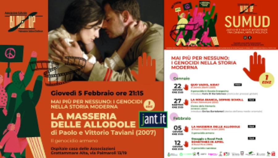 Prosegue la 31a stagione dell’Associazione Blow Up di Grottammare, intitolata SUMUD – Antiche e Nuove Resistenze tra cinema, arte e politica. Giovedì 5 febbraio ci sarà il 3° appuntamento per la minirassegna tematica dedicata ai genocidi nelle loro drammatiche e svariate manifestazioni, "Mai più per nessuno - I genocidi nella storia moderna", e stavolta ci occuperemo del genocidio a danno degli Armeni col film LA MASSERIA DELLE ALLODOLE di Paolo e Vittorio Taviani (2007). "Turchia, 1915, durante la 1a guerra mondiale. In una cittadina vive la benestante famiglia armena degli Avakian. Nel giorno in cui vengono colpiti dal lutto per la morte del patriarca anche il generale Arkan, capo della guarnigione turca, è presente alle esequie. È il segno di un rapporto, se non di amicizia, di reciproco rispetto tra le due comunità. Ma i "Giovani Turchi", che perseguono un progetto di stato-nazione esclusivo e intollerante verso le minoranze, hanno già pronto un piano per creare la Grande Turchia in cui non ci sarà posto per i ricchi e 'traditori' Armeni. Nessuna mediazione si rivela possibile. Dalla capitale partono per ogni dove gruppi di militari con l'ordine di uccidere sul posto i maschi (di qualunque età essi siano) e di deportare le donne e le bambine per poi massacrarle nei pressi di Aleppo. La famiglia Avakian viene smembrata e la giovane e vitale Nunik farà di tutto per salvaguardare la vita delle più piccole." (mymovies) Ingresso gratuito con tessera-abbonamento FIC 2025-2026 (euro 10) sottoscrivibile nella sede di Blow Up adiacente la sala proiezioni o presso la libreria “Nave Cervo” in via Volturno a San Benedetto del Tronto.