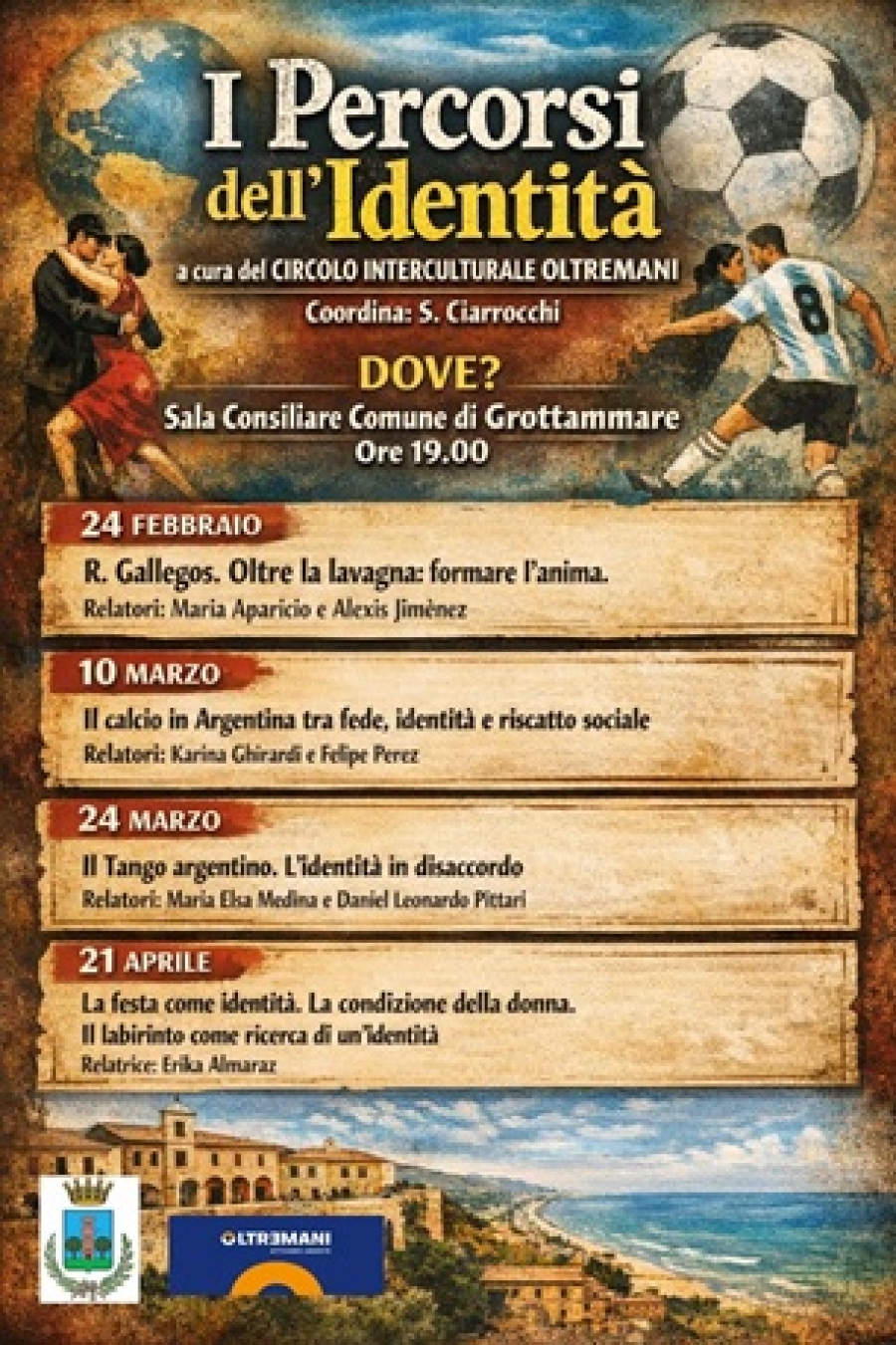 Prenderà il via il 24 febbraio nella Sala Consiliare, il primo appuntamento del ciclo “I Percorsi dell’Identità”. L’iniziativa è curata dal Circolo Interculturale Oltremani e coordinata dal prof. Saverio Ciarrocchi. Gli appuntamenti sono quattro a partire dal 24 febbraio. La partecipazione è aperta a tutti.