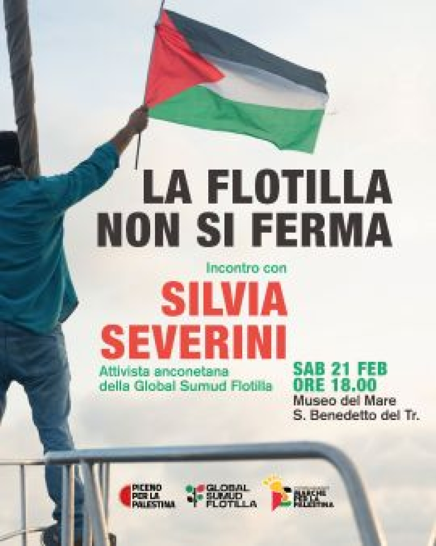 In un contesto internazionale inquietante, dove l'attenzione sulla Palestina è scesa tra propaganda e misure repressive, c'è chi non si arrende al destino di colonialismo, genocidio e totale cancellazione che Israele e Occidente hanno disegnato per la Palestina. Infatti, mentre l'ONU viene esautorato dal Board of Peace, organismo illeggittimo e privato, fondato su speculazione e colonialismo, in tutto il mondo migliaia di persone stanno organizzando una incredibile iniziativa dal basso per fare quello che nessun organismo e istituzione sta facendo : difendere il popolo palestinese. - Che pace è quella in cui la popolazione civile di Gaza continua a morire per mano di Isrele? Sotto bombardamenti, di fame e di freddo con le associazioni umanitarie come Caritas e MSF che vengono cacciate e gli aiuti bloccati? - Che pace è quella in cui la vita dei e delle prigioniere palestinesi detenute arbitrariamente non conta nulla? Possono essere torturate, i loro corpi mutilati e adesso anche sottoposti alla pena di morte senza alcuna indignazione internazionale? - Che pace è quella dove il colonialismo d'insediamento illegale in Cisgiordania continua ogni giorno a cacciare la popolazione palestinese della loro case con addirittura nuove leggi per l'espansione nell'area A?L'unica area di totale amministrazione palestinese secondo gli Accordi di Oslo! - Che pace è quella secondo cui i condannati criminali di guerra che hanno utilizzato armi iperbariche (che disintegrano i corpi!) possono proseguire il loro colonialismo genocidiario nei territori occupati illegalmente senza alcun freno come fosse lecito? Non è pace. È ,appunto, colonialismo che continua nel silenzio generale. E per questo la Flottila riparte. Ed ha bisogno, di nuovo, del suo equipaggio di terra per riuscire nella sua missione: rompere l'assedio e far ripartire una grande mobilitazione internazionale per la liberazione della Palestina! Ne parleremo insieme a Silvia Severini, attivista che a settembre è salpata sulla Global Sumud Flotilla per Gaza. Appuntamento: sabato 21 febbraio Ore 18.00 Museo del Mare San Benedetto del Tronto