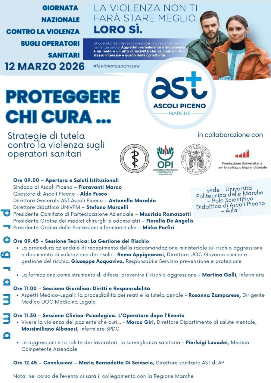 strategie di tutela contro la violenza sugli operatori sanitari’: è questo il titolo dell’evento organizzato dall’Ast di Ascoli, in collaborazione con gli Ordini delle professioni infermieristiche e dei medici chirurghi e odontoiatri di Ascoli e l’Università Politecnica delle Marche, per il prossimo 12 marzo, dalle 9 alle 13, all’ospedale ‘Mazzoni’ (aula di infermieristica al piano terra), in occasione della Giornata nazionale di educazione e prevenzione contro la violenza nei confronti degli operatori sanitari e sociosanitari Nell’Ast di Ascoli, nel 2025, gli episodi di violenza registrati dall’azienda ai danni degli operatori sanitari e sociosanitari sono stati complessivamente 60, di cui 44 di natura verbale (insulti, minacce), 9 di natura fisica e 7 di natura sia verbale che fisica. Dall’analisi degli eventi suddivisi per sede e unità operativa emerge che la maggior parte ha interessato strutture territoriali con 31 episodi distribuiti tra Casa circondariale (21), Rsa e poliambulatori, mentre nei due ospedali le aggressioni sono state: 11 in quello di Ascoli, di cui il numero più elevato, ovvero 4, al Pronto soccorso, 18 in quello di San Benedetto, di cui il numero più elevato, ovvero 8, nel Servizio psichiatrico di diagnosi e cura (Spdc). La figura professionale maggiormente destinataria di aggressioni è risultata essere quella dell’infermiere, seguita da quella dell’operatore sociosanitario, mentre aggressore è stato quasi sempre il paziente, in pochissimi casi un parente. Nel corso dell’evento organizzato dall’Ast di Ascoli in occasione della Giornata istituita dal Ministero della salute nel 2022 per sensibilizzare sul rispetto degli operatori sanitari e sociosanitari attraverso la promozione di una cultura della non violenza, dirigenti medici e personale infermieristico illustreranno quali sono le strategie di tutela adottate dall’azienda sanitaria nei confronti dei propri dipendenti. A tal proposito è importante ricordare anche come, nel luglio scorso, l’Ast abbia sottoscritto un protocollo d’intesa per la sicurezza degli operatori nei due ospedali piceni con la Questura e la Prefettura di Ascoli. Il programma del 12 marzo si apre con i saluti del direttore generale dell’Ast di Ascoli, Antonello Maraldo, del direttore del corso di laurea triennale in infermieristica dell’Univpm, Stefano Marcelli, del sindaco di Ascoli, Marco Fioravanti, del vicario del questore Francesco Costantini, del presidente del Comitato di partecipazione dell’Ast di Ascoli, Maurizio Ramazzotti, dei presidenti dell’Ordine dei medici chirurghi e odontoiatri, Fiorella De Angelis, e dell’Ordine delle professioni infermieristiche, Mirko Porfiri. Quindi, spazio agli interventi suddivisi per sessioni. La prima, la sessione tecnica ‘La gestione del rischio’, è a cura di Remo Appignanesi dell’Uo governo clinico e gestione del rischio e del responsabile del Servizio prevenzione e protezione, Giuseppe Acquaviva, che illustrano ‘La procedura aziendale di recepimento della raccomandazione ministeriale sul rischio aggressione e documento di valutazione dei rischi’, mentre l’infermiera Martina Galli parlerà della ‘Formazione come strumento di difesa: prevenire il rischio aggressione’. Spazio, poi, alla sessione giuridica ‘Diritti e responsabilità’ nel corso della quale la dottoressa Rosanna Zamparese dell’Uo medicina legale affronta la tematica: ‘Aspetti medico-legali: la procedibilità dei reati e la tutela penale’, e alla sessione clinico-psicologica ‘L’operatore dopo l’evento’ in cui il direttore del dipartimento di salute mentale Marco Giri, e l’infermiere dell’Spdc Massimiliano Albanesi affrontano la tematica del ‘Vivere la violenza del paziente che curi’. Il medico competente Pierluigi Lucadei chiude la sessione parlando delle ‘Aggressioni e la salute dei lavoratori: la sorveglianza sanitaria’. Conclude il direttore sanitario Maria Bernadette Di Sciascio.