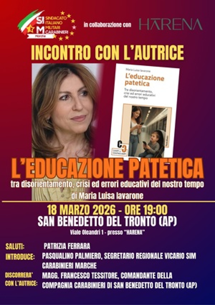 · Mercoledì 18 marzo, ore 19:00 | Presso "Harena" Il SIM Carabinieri, in sinergia con la Dott.ssa Patrizia Ferrara, presenta l’ultima opera della docente: “L’educazione patetica”. Un incontro aperto al pubblico per esplorare le radici del disagio giovanile e del bullismo. Al dibattito interverrà il Magg. Francesco Tessitore, Comandante della Compagnia Carabinieri di San Benedetto del Tronto, per offrire un punto di vista operativo e territoriale sulla sicurezza dei minori.