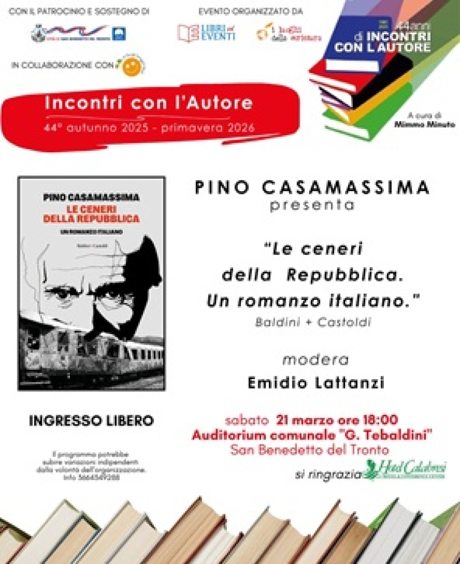 L’evento rientra nella rassegna culturale cittadina dedicata alla promozione della lettura. Sarà sabato 21 marzo alle ore 18:00 all’Auditorium comunale “G. Tebaldini” di San Benedetto del Tronto la presentazione del libro Le ceneri della Repubblica di Pino Casamassima, inserita nel calendario della rassegna “Incontri con l’autore”. L’iniziativa, a ingresso libero, è promossa dall’associazione I Luoghi della Scrittura con il supporto di Libri ed Eventi e il patrocinio del Comune di San Benedetto del Tronto, nell’ambito della 44ª edizione della rassegna (autunno 2025 – primavera 2026). Nel corso dell’incontro, introdotto dal presidente dell'associazione I Luoghi della Scrittura Mimmo Minuto e moderato dal giornalista Emidio Lattanzi, l’autore presenterà un’opera che si configura come un romanzo d’inchiesta, capace di intrecciare narrazione e fatti storici reali. Il libro affronta i misteri irrisolti della storia italiana, con riferimenti agli anni di piombo, alla strategia della tensione e alle stragi, tra cui la Strage di Bologna, ponendo al centro il tema dei depistaggi e dei possibili legami con apparati deviati dello Stato. La trama si sviluppa tra passato e presente, seguendo un’indagine che coinvolge un giornalista e un ex ufficiale della Guardia di Finanza, impegnati a ricostruire una rete di documenti, testimonianze e verità nascoste, in un contesto in cui i confini tra verità ufficiale e realtà storica restano incerti. Pino Casamassima, giornalista e autore di numerosi saggi e romanzi, è da anni impegnato nello studio del terrorismo italiano e delle vicende più controverse della Prima Repubblica. Nel corso della sua attività è stato anche ascoltato da commissioni parlamentari, tra cui quella sul caso Aldo Moro. L’appuntamento rappresenta il recupero dell’incontro inizialmente previsto qualche settimana fa e poi rinviato.