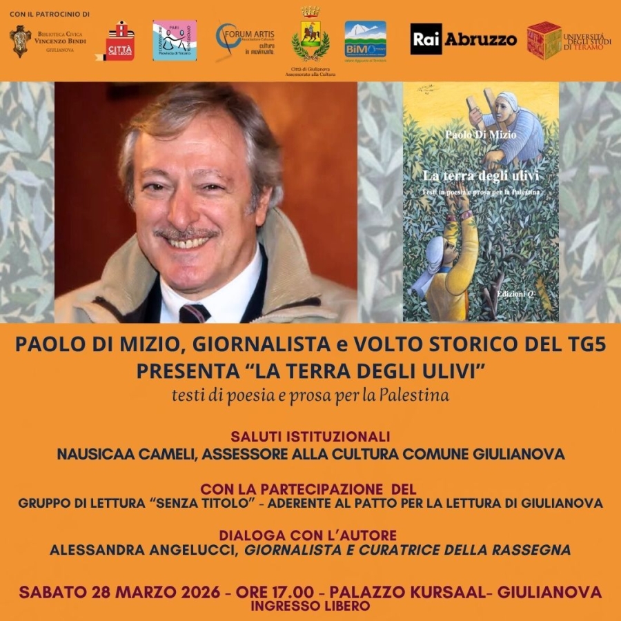 la rassegna organizzata da “Forum Artis Cultura in movimento” in collaborazione con l’Assessorato alla Cultura e la Biblioteca Civica “Vincenzo Bindi”. Il nuovo incontro si terrà sabato 28 marzo, alle ore 17, a palazzo Kursaal, e vedrà Di Mizio presentare il suo nuovo lavoro editoriale: “La terra degli ulivi. Testi in poesia e prosa per la Palestina” (Q Edizioni). L’autore, a dialogo con la giornalista Alessandra Angelucci, ripercorrerà le tappe salienti del suo percorso professionale e racconterà la spinta emotiva che lo ha portato a scrivere un libro, accorato e attuale, dedicato alle stragi compiute dagli Israeliani contro i Palestinesi di Gaza. “Mai s’era visto/nella Storia/ mai s’era visto/ un popolo che manda al mondo/ in diretta/ in tempo reale/ la visione/ del proprio martirio”: così ne “La terra degli ulivi”, un libro che permette di allargare lo sguardo e di capire. Oltre alle liriche, il lettore troverà anche pagine scritte prima dell’ottobre 2023, man mano che l’autore acquistava coscienza degli infiniti orrori cui il popolo palestinese è stato sottoposto a partire dagli anni ’40 del secolo scorso. L’evento sarà aperto dai saluti istituzionali dell’ assessore alla Cultura Nausicaa Cameli. Parteciperà il gruppo di lettura “Senza Titolo”, che aderisce al Patto per la Lettura. “Parole in Circolo” è patrocinata da Rai Abruzzo, Bim, Università degli Studi Teramo e Commissione Provinciale per le Pari Opportunità. “Anche stavolta invitiamo tutti a partecipare – commenta l’assessore Cameli – Paolo Di Mizio, che ringraziamo per l’affetto che lo lega a Giulianova, è un giornalista intelligente, sensibile, dal garbo inconfondibile. Ascoltarlo sarà un piacere per la mente e per il cuore.”