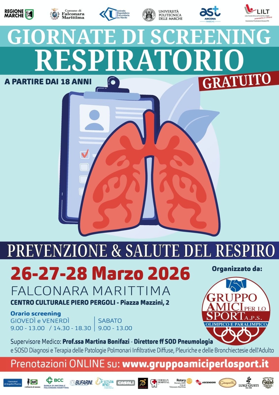 Tutelare il proprio benessere significa garantire un futuro migliore a noi stessi. In quest'ottica, la gratuità e l'accessibilità degli screening rappresentano gli strumenti fondamentali di un programma di prevenzione secondaria, il cui scopo è intercettare precocemente fattori di rischio ed escludere l'insorgenza di problematiche più serie. Le giornate di screening, in presenza di medici specializzandi in pneumologia dell'Azienda Ospedaliera Universitaria delle Marche, avranno luogo presso il Centro Culturale Piero Pergoli in piazza Mazzini a Falconara Marittima, secondo il seguente calendario: giovedì 26 e venerdì 27 marzo dalle 09:00 alle 13:00 e dalle 14:30 alle 18:30; sabato 28 marzo dalle 9:00 alle 13:00. L'interesse della cittadinanza è stato immediato: nell’arco di due giorni, hanno raggiunto quota 403 le persone che hanno formalizzato la propria adesione. Sabato scorso si è tenuta la conferenza stampa di presentazione al Centro Culturale Piero Pergoli, moderata da Tarcisio Pacetti, che si è aperta con un doveroso e commosso ricordo del socio Daniele Gianfelici, venuto a mancare a gennaio, in presenza della moglie Antonella, figura sempre disponibile nel fornire utili suggerimenti organizzativi per le iniziative di prevenzione. Un momento di riflessione, un'occasione di incontro e un servizio concreto a favore della cittadinanza nel contesto di un'iniziativa che vuole unire il valore della prevenzione alla forza della partnership tra associazionismo sportivo, istituzioni e sanità pubblica. Tarcisio Pacetti, Presidente Gruppo Amici per lo Sport: “Prevenzione e attività fisica devono andare di pari passo. Grazie alla Prof.ssa Martina Bonifazi, offriamo alla cittadinanza un'opportunità concreta di salute. Prendersi cura del proprio respiro significa investire sul futuro”. Martina Bonifazi, Direttrice Facente Funzioni della Struttura Organizzativa Dipartimentale di Pneumologia presso l’Azienda Ospedaliero Universitaria delle Marche: “Ringrazio il Gruppo Amici per lo Sport per il supporto fondamentale verso questa iniziativa di prevenzione ancora troppo poco sviluppata nel nostro sistema sanitario. Questi screening rappresentano un'occasione di accesso equo per tutti, utile a una prima valutazione della salute respiratoria. Seppur con strumentazioni non esaustive, offriamo alla popolazione un'opportunità concreta di diagnosi precoce, ancor più importante oggi che l'inquinamento ambientale incide significativamente sul nostro benessere”. Claudio Martini, Direttore Sanitario presso l’Azienda Ospedaliero Universitaria delle Marche: “Pur dedicandoci all'alta specialità, crediamo fermamente nella prevenzione come pilastro della sanità pubblica. Con il contributo della pneumologia, offriamo alla popolazione uno screening utile a intercettare situazioni potenzialmente critiche, complementare ai programmi istituzionali. Il nostro impegno per la comunità c'è sempre: grazie per averci coinvolti”. Luca Savoiardi, Presidente Regionale CIP Marche: “A nome del CIP regionale e del Panathlon Club di Ancona, sosteniamo con convinzione questa iniziativa perché crediamo fermamente che sport e salute siano un binomio inscindibile, e la prevenzione ne è parte integrante. Progetti come questo vanno incoraggiati per migliorare concretamente la qualità della vita delle persone. Grazie al Gruppo Amici per lo Sport per averci coinvolti in un appuntamento di vero valore per la comunità”. Andrea Santarelli, Prorettore dell’Università Politecnica delle Marche: “L'Università accoglie con piacere questa iniziativa, come ormai da diversi anni, per dimostrare il valore che la prevenzione ha per la comunità di riferimento. È la prova che la cooperazione tra istituzioni può generare una sinergia reale a beneficio della popolazione. Grazie al Gruppo Amici per lo Sport per aver costruito insieme questo percorso di salute condiviso”. Paolo Calcinaro, Assessore alla Sanità per la Regione Marche: “Ci tengo a ringraziare Tarcisio Pacetti, la Sindaca Signorini, la Dott.ssa Bonifazi e tutto il team per questa importante iniziativa di prevenzione respiratoria. Questi screening sono un'aggiunta preziosa al sistema sanitario, utili per raggiungere chi oggi rischia di rimanere escluso dalle cure. Non sostituiscono i servizi essenziali, ma integrano l'offerta con un impatto positivo e capillare sulla comunità”. Tiziano Consoli, Assessore allo sport per la Regione Marche: “Sport e salute sono un binomio inscindibile: questa iniziativa si inserisce in una visione culturale che promuove la prevenzione come stile di vita. Stiamo lavorando a una riforma regionale per riconoscere l'attività sportiva come 'medicina sostitutiva', prescrivibile per il benessere dei cittadini. Tutto questo è possibile grazie ad associazioni come il Gruppo Amici per lo Sport, che ringrazio per l'impegno inclusivo e costante sul territorio”. Stefania Signorini, Sindaco di Falconara Marittima: “La prevenzione non deve spaventare, significa prendersi cura di sé in anticipo, agire oggi per stare meglio domani. Queste giornate sono fondamentali non solo sotto il profilo medico, ma anche sociale e inclusivo, creando momenti di incontro e conoscenza tra i cittadini. Ringrazio di cuore il Gruppo Amici per lo Sport e il suo presidente Tarcisio Pacetti, perchè la loro capacità di unire salute e inclusione è un esempio virtuoso per tutta la nostra città”. Ilenia Orologio, Assessore alle politiche sociali di Falconara Marittima: “Prevenzione non è un termine da temere, ma un invito a prendersi cura di sé: sport e salute vanno di pari passo per il benessere di tutti. Sosteniamo con convinzione questa associazione, punto di riferimento per il territorio, in un rapporto di collaborazione reciproca che beneficia l'intera comunità”. Fulvio Borromei, Presidente dell’Ordine dei Medici di Ancona: “Queste giornate dal 26 al 28 marzo, con test rapidi e non invasivi, sono cruciali per sviluppare 